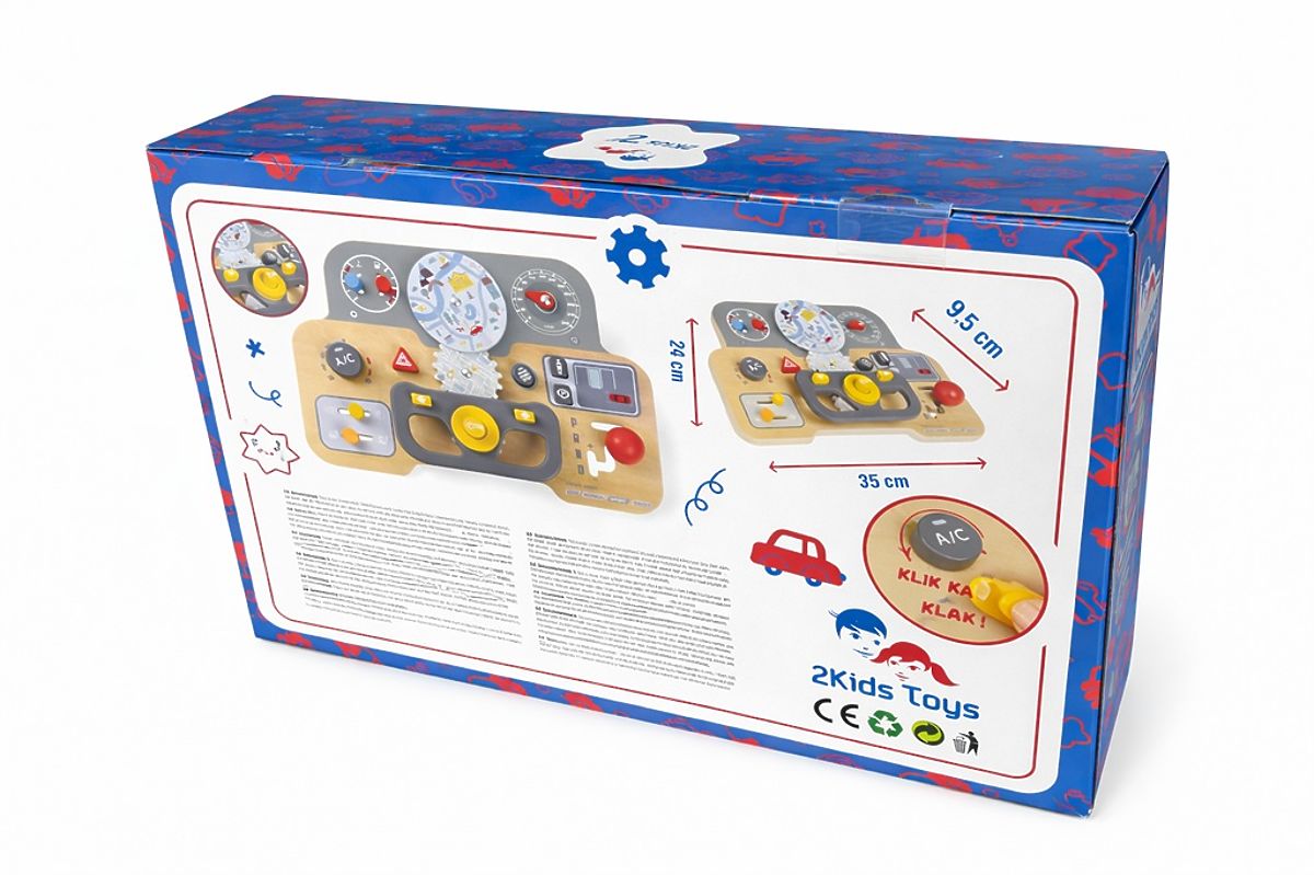 Maman, papa, aujourd'hui c'est moi qui conduis ! Ce tableau d'activités offre beaucoup de plaisir, permettant à votre enfant de développer sa dextérité, sa curiosité et surtout sa motricité fine. Les éléments interactifs tels que les boutons ou les roues rotatives donnent à l'enfant l'occasion de s'exercer à différents mouvements, rotations ou clics, et de se préparer ainsi aux tâches quotidiennes. En plus des activités impliquant des compétences sensorielles, le tableau est équipé d'un volant - une excellente opportunité pour pousser le jeu imaginatif encore plus loin. Et en plus, ils peuvent même klaxonner en route. Le voyage sera long ! Principales caractéristiques : favorise l'indépendance, la motricité fine et la coordination main-œil, stimule la pensée créative et le développement de l'imagination, stimulation sensorielle, éducation par le jeu, design élégant qui ravira les garçons et les filles, émet un son de klaxon.