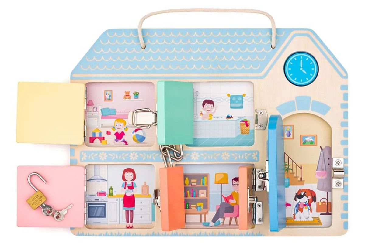 Petites mains, grands déverrouillages ! Cinq serrures différentes et des secrets derrière chaque porte – tout cela favorise la concentration, la patience et l'apprentissage ludique. Ce tableau éducatif combine compétences motrices et pensée logique.