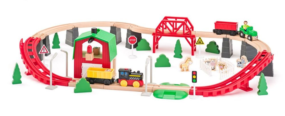 Quelque part dans une ferme pittoresque, au milieu de prairies verdoyantes et du chant des oiseaux, la vie s'écoule paisiblement. Chaque matin, le fermier se lève pour s'occuper des animaux et préparer l'arrivée du train qui apporte des récoltes fraîches et transporte des marchandises vers la ville. La locomotive électrique arrive en sifflant à travers les collines, accueillie par le joyeux meuglement des vaches et le hennissement des chevaux. Cet ensemble ferroviaire exceptionnel à thème agricole permet aux enfants de se transporter dans un monde où ils peuvent construire, jouer et développer leur imagination.