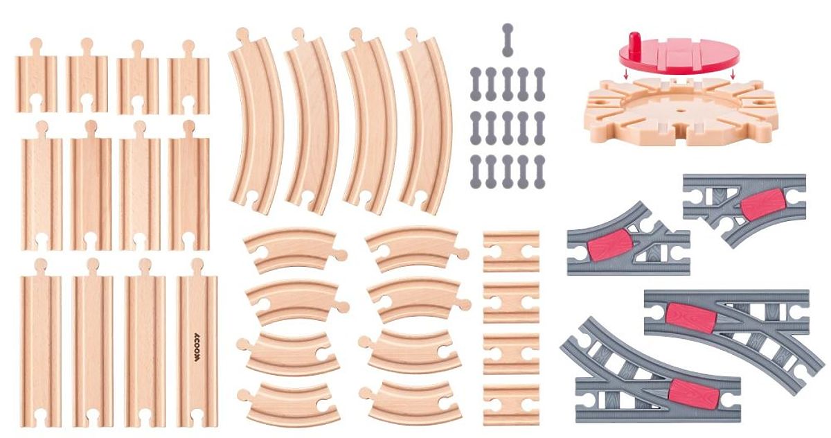 Les éléments de rail sont compatibles avec les produits d'autres fabricants tels que : Brio, IKEA, ELC, Little Steps, Eichhorn, Woodyland, Tesco, Carousel, Bigjigs, etc., ce qui permet d'étendre facilement le circuit ou de le connecter à un autre.