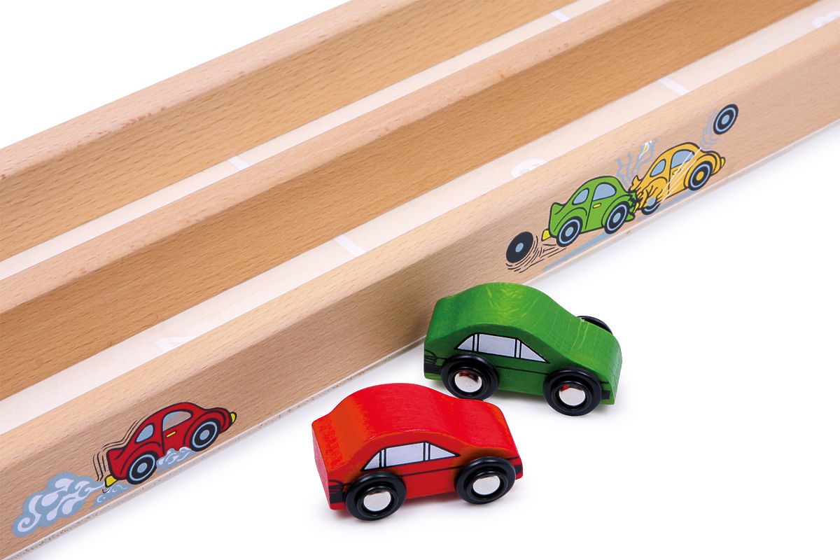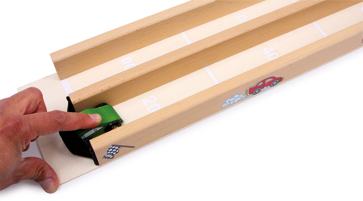 La longue rampe de course est équipée d'un lanceur en caoutchouc. Il suffit de tirer et la voiture démarre, et vous n'avez plus qu'à observer quelle voiture .. plus