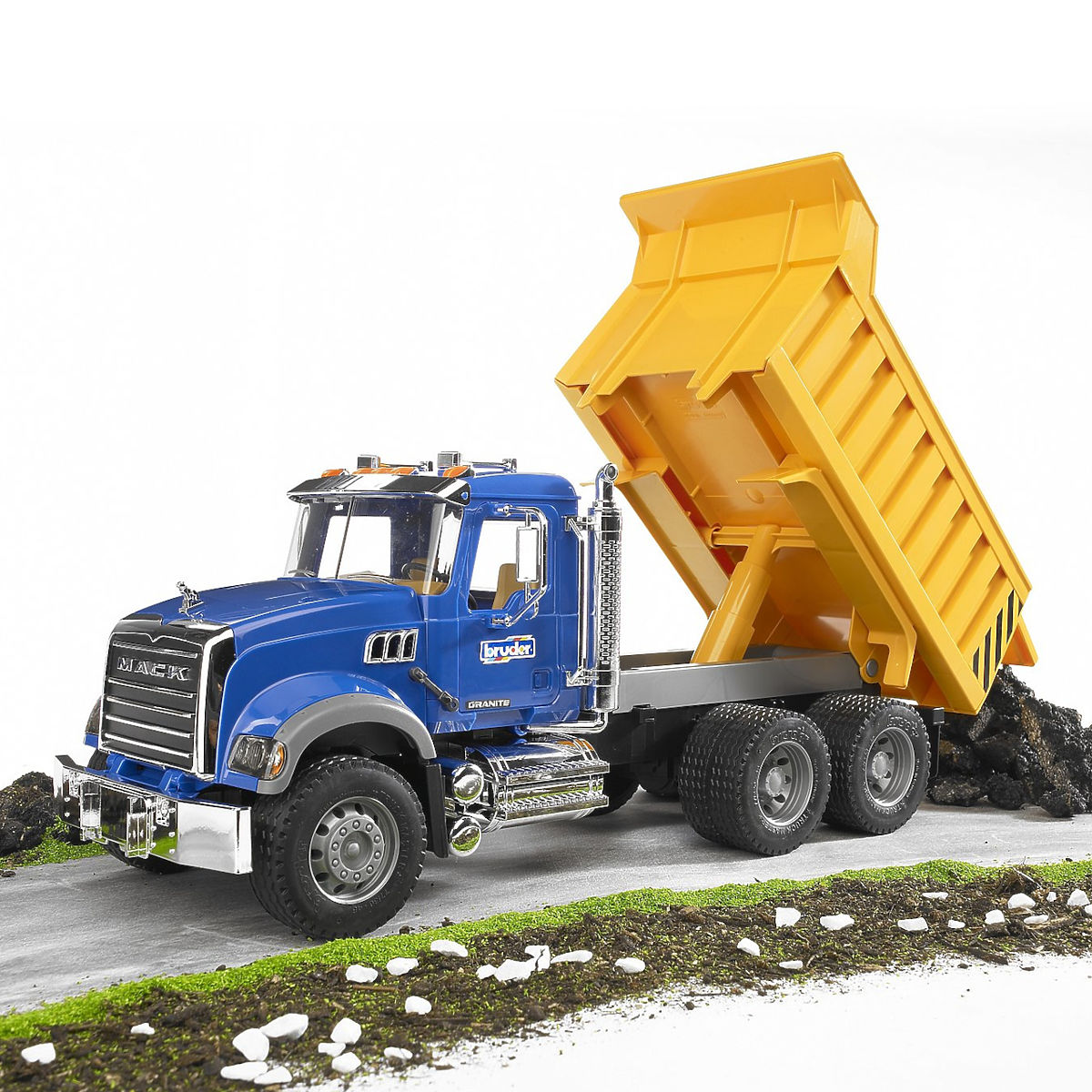 Le camion benne Bruder MACK Granite, modèle du véhicule américain MACK Granite avec des accessoires chromés, dispose d'un capot avant basculant permettant de .. plus