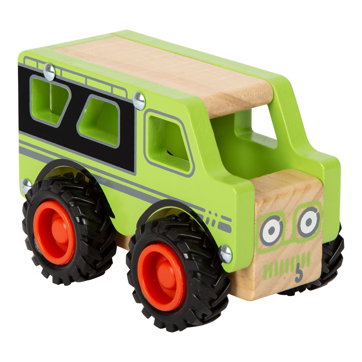 Voiture tout-terrain en bois avec cabine spacieuse et roues silencieuses. .. plus