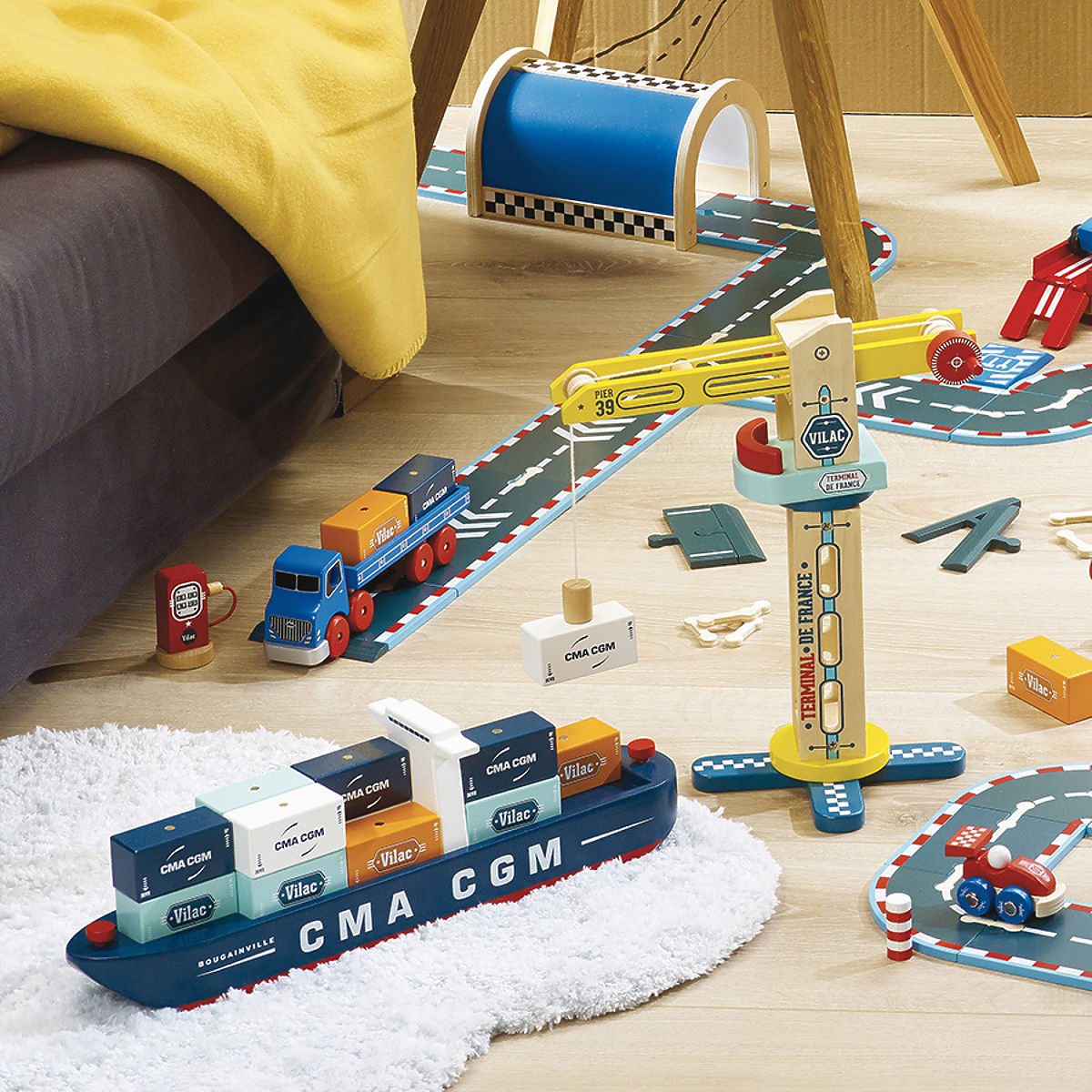 Un camion en bois avec une remorque et des conteneurs reliés magnétiquement, fabriqué en collaboration avec la société de transport française de premier plan CMA CGM. Il fait partie de la collection Vilacity et est entièrement compatible avec tous ses composants, des extensions supplémentaires indépendantes apporteront de la variété et enrichiront l'expérience de jeu. Principales caractéristiques : camion, remorque et 4 conteneurs connexions magnétiques compatible avec tous les composants de la collection Vilac Vilacity fabriqué de manière écologique, respectueux de l'environnement V2357 – Grue portuaire Vilacity (non incluse dans le set, disponible dans notre offre) : V2356 – Navire de charge Vilacity (non inclus dans le set, disponible dans notre offre) : V2356S – Navire de charge Jacques Saadé Vilacity (non inclus dans le set, disponible dans notre offre) : Exemple d'assemblage du camion avec d'autres composants de la collection Vilacity :