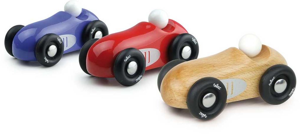 Voiture de course fabriquée en bois laqué de couleur rouge, avec des roues en caoutchouc massif. Convient aussi bien pour jouer que comme décoration dans les chambres d'enfants ou d'adultes. Fabriqué en France. Principales caractéristiques : fabriqué en France