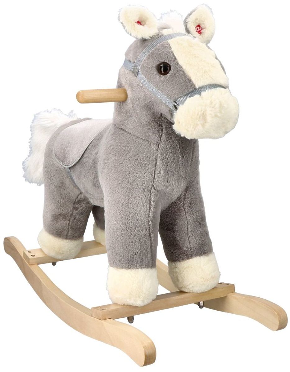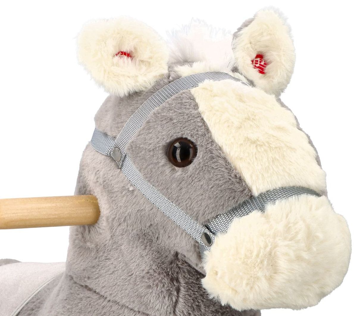 Ce magnifique cheval est fabriqué en peluche douce de couleur grise avec des accessoires blancs comme la crinière, le museau et la queue. La bride et la selle sont également grises. Les patins et les poignées sont en bois léger et agréable au toucher.