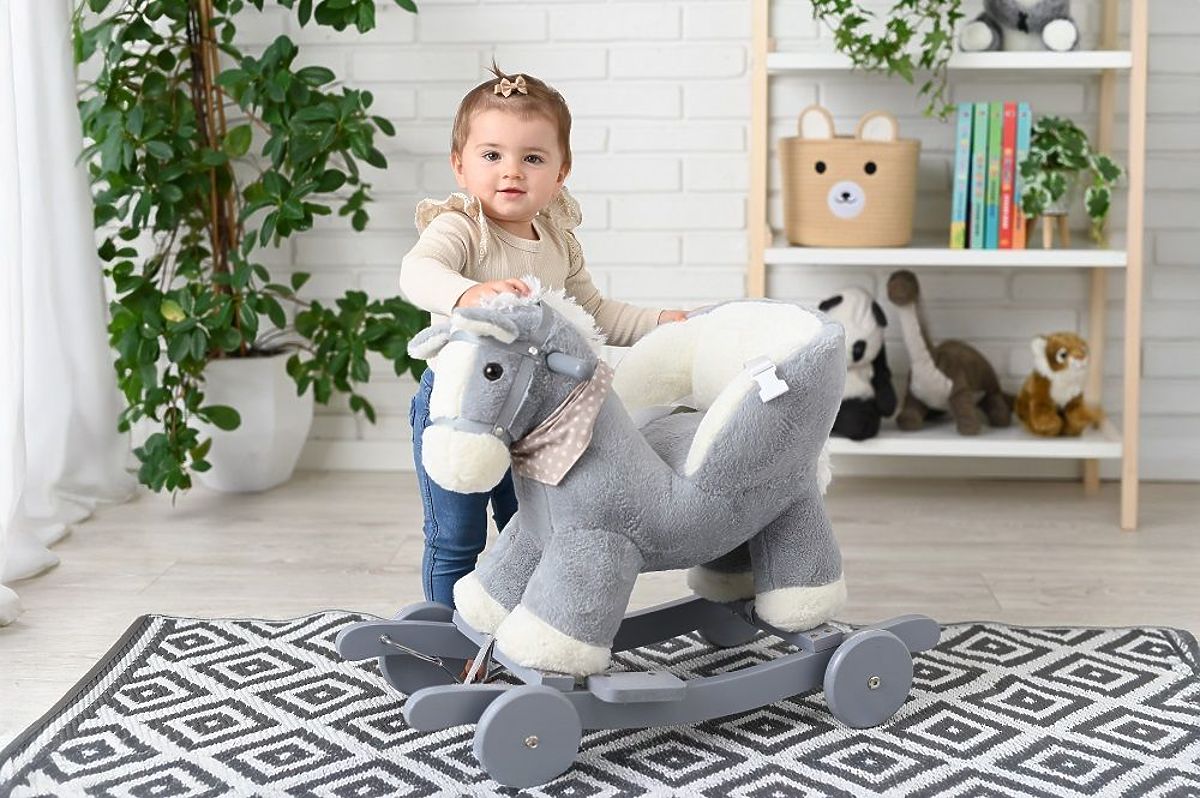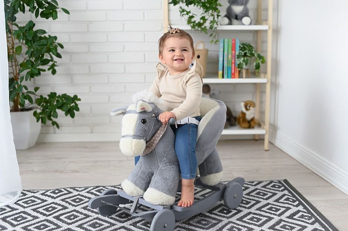 Cheval à bascule avec roues dans une nouvelle version adorable. Couleur douce, doux et agréable au toucher, confortable et sûr - ce ne sont que quelques-uns de ses nombreux atouts. Il deviendra certainement le compagnon de nombreux jeux fantastiques de votre enfant.