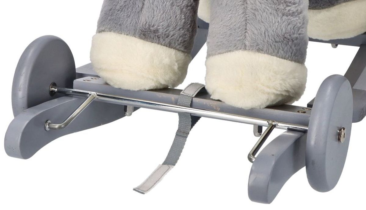 Le cheval a des roues en bois, ce qui lui permet, selon leur réglage, d'être un cheval à bascule ou un porteur. La transformation du porteur en cheval à bascule est très facile. Il n'est pas nécessaire de démonter quoi que ce soit, il suffit de détacher une sangle spéciale et de tourner les roues de l'autre côté des patins. C'est fait!