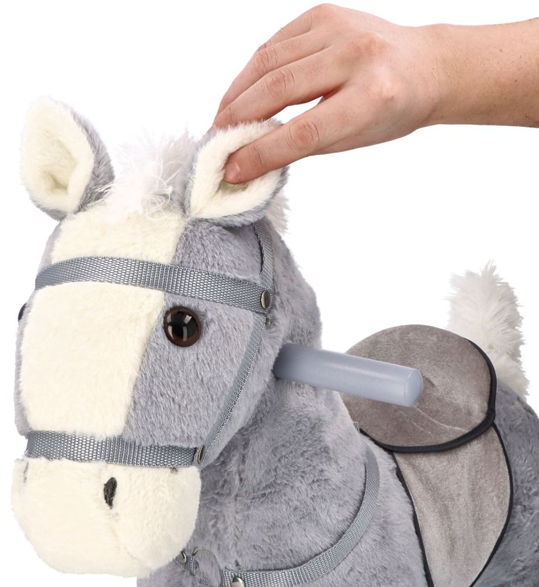 Une autre caractéristique du cheval à bascule est le son que notre cheval interactif émet lorsqu'il est en mouvement. Il suffit d'appuyer sur une oreille pour entendre le bruit des sabots et le hennissement d'un cheval satisfait.