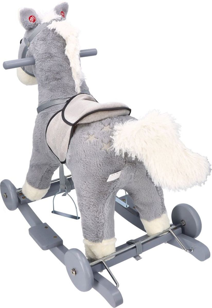 Ce qui lui donne du charme et du caractère, ce sont les accessoires gris, à savoir la selle et la bride. Le cheval est également équipé de patins en bois gris, de roulettes et de poignées.