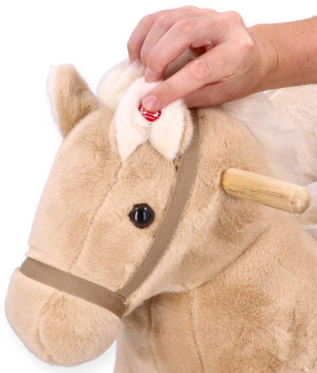 Le jouet nécessite deux piles AA. Le compartiment à piles est caché sous le ventre du cheval.