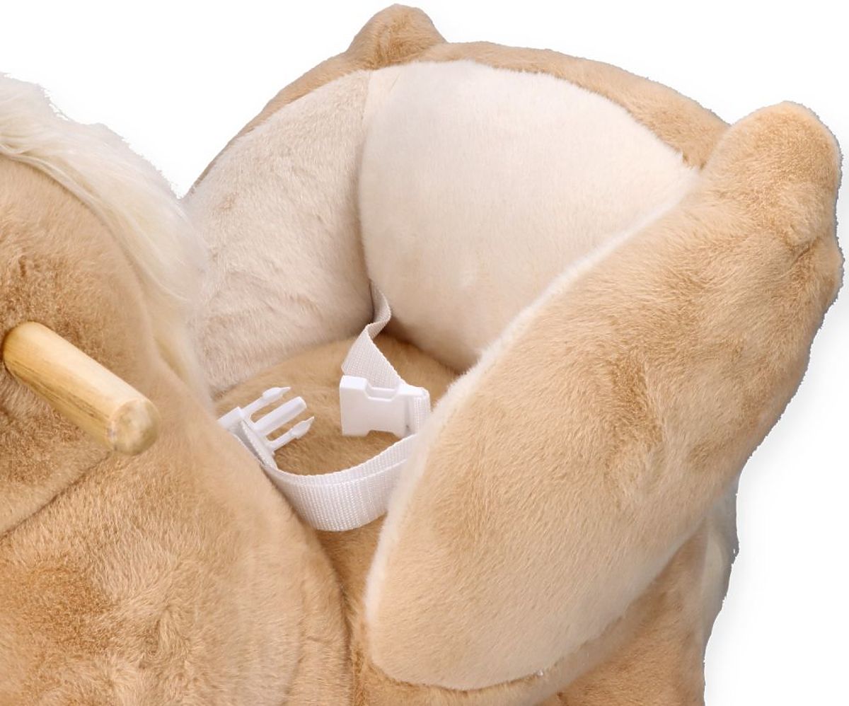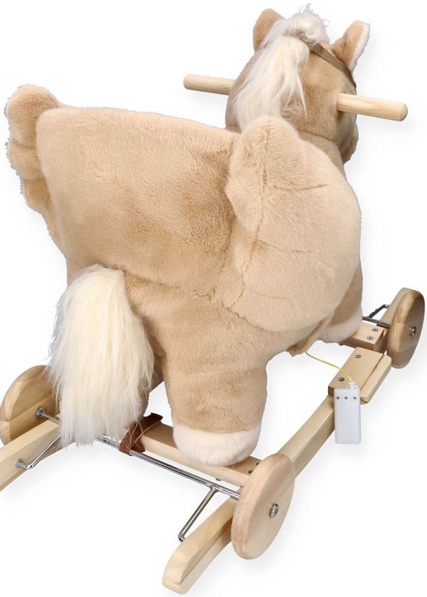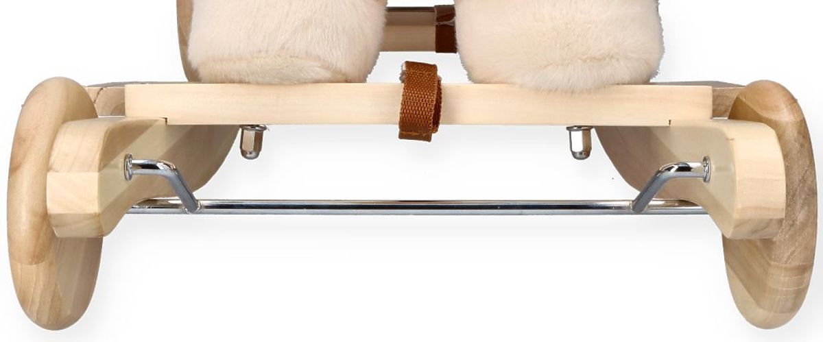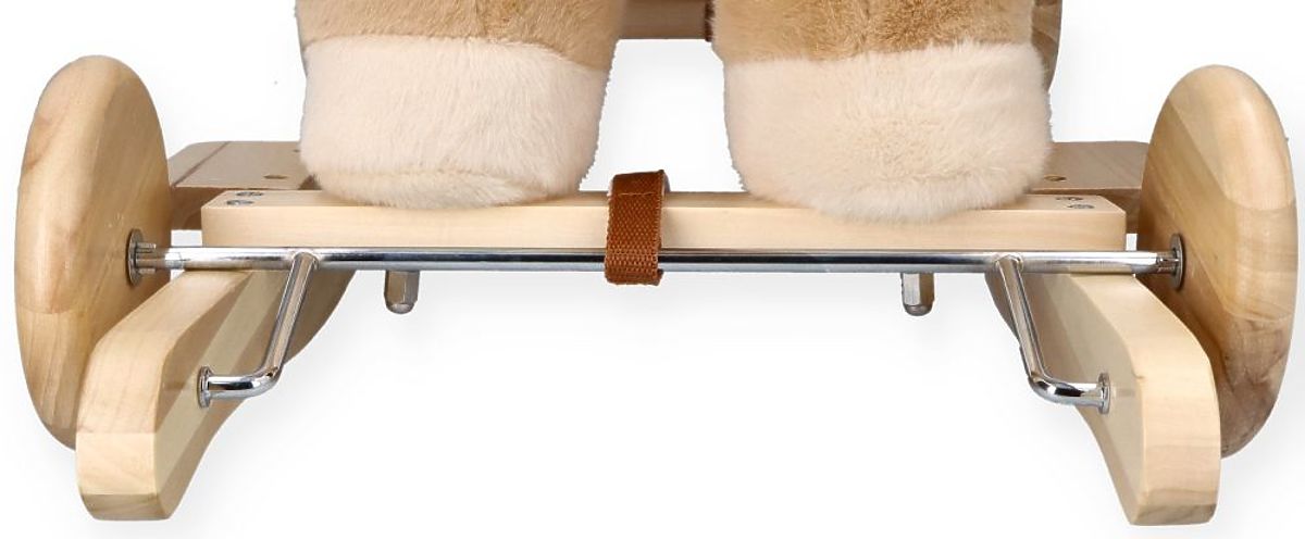 Le Pégase est fabriqué en matière pelucheuse douce et agréable au toucher dans une couleur beige douce. Les patins et les poignées sont en bois de couleur naturelle, ce qui s'accorde parfaitement avec le concept global. Notre ami en peluche a des roues en bois qui permettent, selon leur disposition, de le transformer en bascule ou en porteur. La transformation de porteur à bascule est très facile. Il n'est pas nécessaire de démonter quoi que ce soit, il suffit de défaire une sangle spéciale et de tourner les roues de l'autre côté des patins. C'est fait !