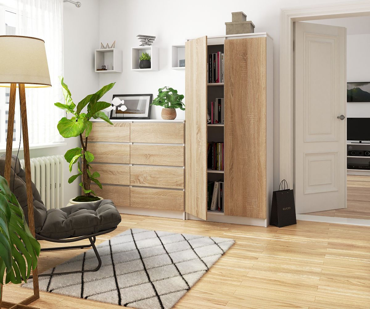 L'armoire de bureau R 80 cm Clip 2 est un meuble en couleur blanc/sonoma, l'une des couleurs les plus populaires de cette saison. Cette bibliothèque apportera ordre et harmonie à votre bureau. Elle est équipée de huit étagères spacieuses où vous pourrez ranger tous les objets nécessaires au bureau. De plus, ses bords sont plaqués avec un chant ABS, offrant une haute protection contre les dommages. Les avantages de cette bibliothèque incluent :