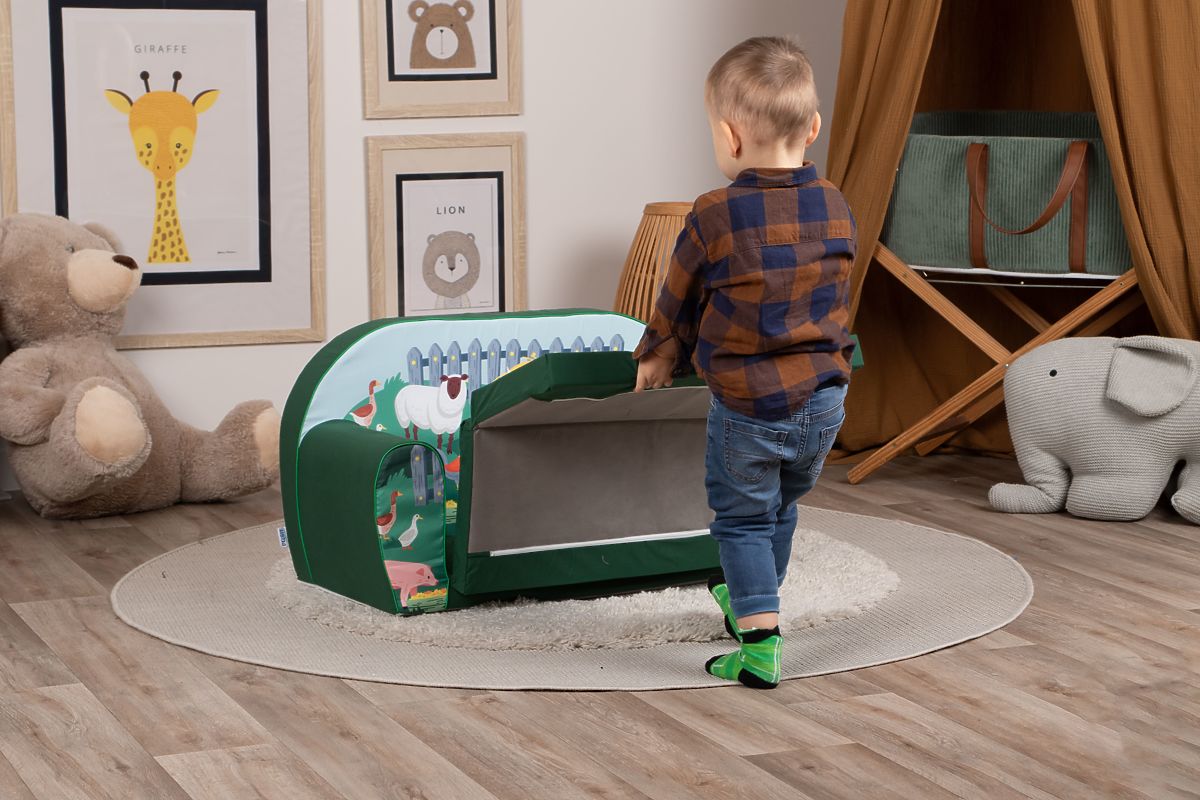 Le canapé avec ses motifs joyeux de vache, mouton, cochon et autres animaux transforme chaque chambre d'enfant en une petite ferme pleine de sérénité. Grâce à son rembourrage en mousse douce, il est idéal pour jouer en toute sécurité, se reposer ou lire ses livres préférés. La housse amovible en tissu agréable et résistant est facile à entretenir, permettant ainsi aux enfants de profiter du confort et aux parents de la tranquillité.