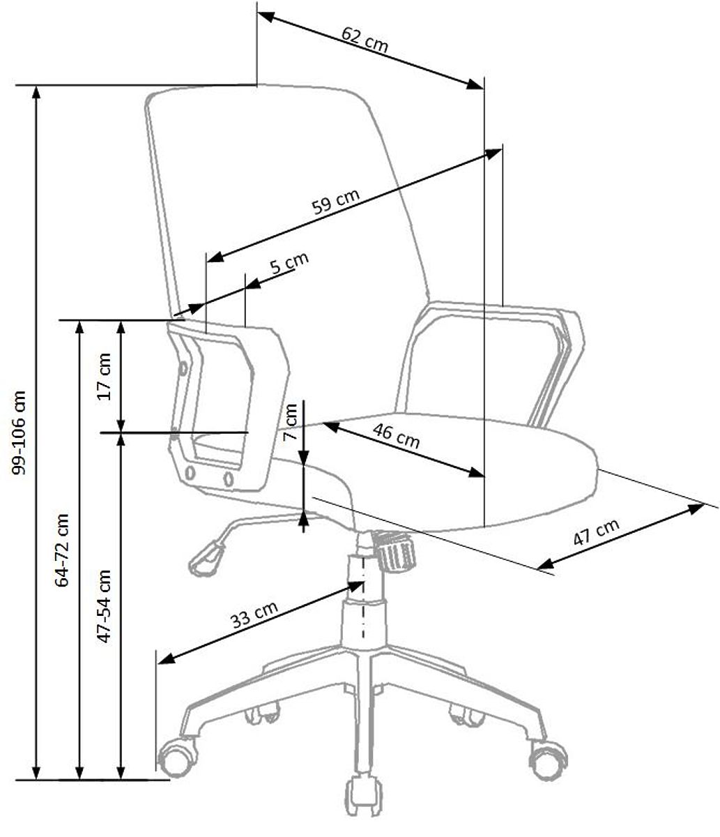La chaise a une construction solide en polypropylène durci blanc et est recouverte d'un tissu d'ameublement respirant. Il dispose d'un mécanisme TILT, grâce auquel vous pouvez facilement régler la hauteur du siège à l'aide du vérin à gaz. L'assise confortable est garantie par des accoudoirs pratiques et cinq roues en plastique.