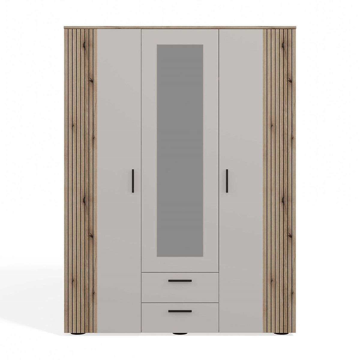 ARMOIRE AVA 150 CM MIROIR 2 TIROIRS FAÇADE RAINURÉE CHÊNE ÉVOQUE BEIGE CACHEMIRE