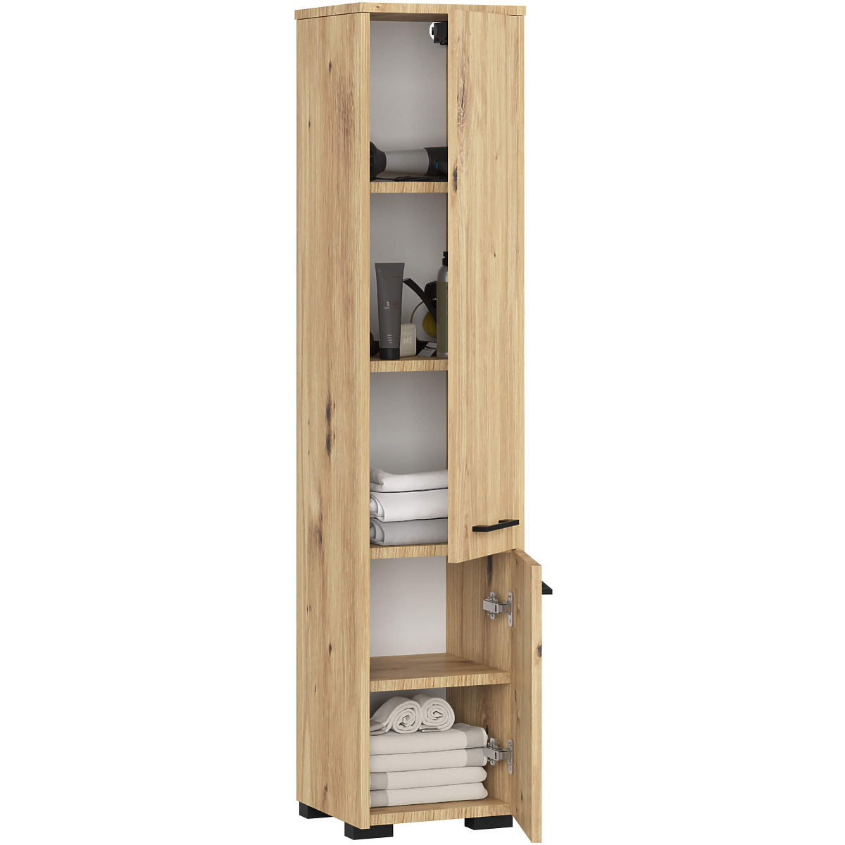 L'armoire de salle de bain Fin 2 portes est un meuble universel qui peut être utilisé dans n'importe quelle salle de bain, quelle que soit sa taille. Son design élégant et sa couleur chêne artisan garantissent que l'armoire s'harmonise parfaitement avec une salle de bain de tout style, avec un équipement classique ou moderne, ainsi qu'avec des carreaux et revêtements de différentes nuances. Grâce à ses dimensions, l'armoire de salle de bain peut remplir un espace souvent inutilisé dans le coin de la salle de bain, tout comme être placée à côté d'un lavabo, d'une machine à laver ou d'une cabine de douche. L'armoire de salle de bain Fin se distingue par une finition très soignée. Elle possède deux portes larges et confortables avec des poignées ergonomiques, assurant un accès facile à l'intérieur du meuble. Les étagères profondes et spacieuses sont idéales pour ranger serviettes, articles de toilette, cosmétiques ou produits de nettoyage. L'armoire de salle de bain est fabriquée en panneau stratifié résistant à l'usure et à l'eau. Les chants ABS, qui terminent l'armoire, sont durables, ne se décolorent pas et protègent en plus l'armoire contre les dommages.