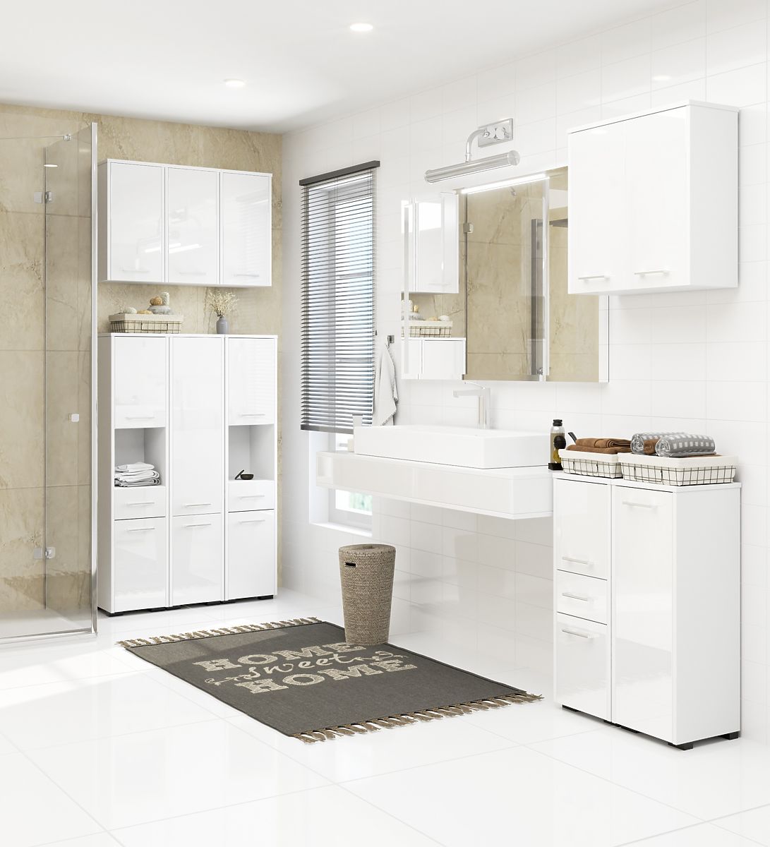 Armoire de salle de bain blanche brillante avec 2 portes et 4 étagères. .. plus