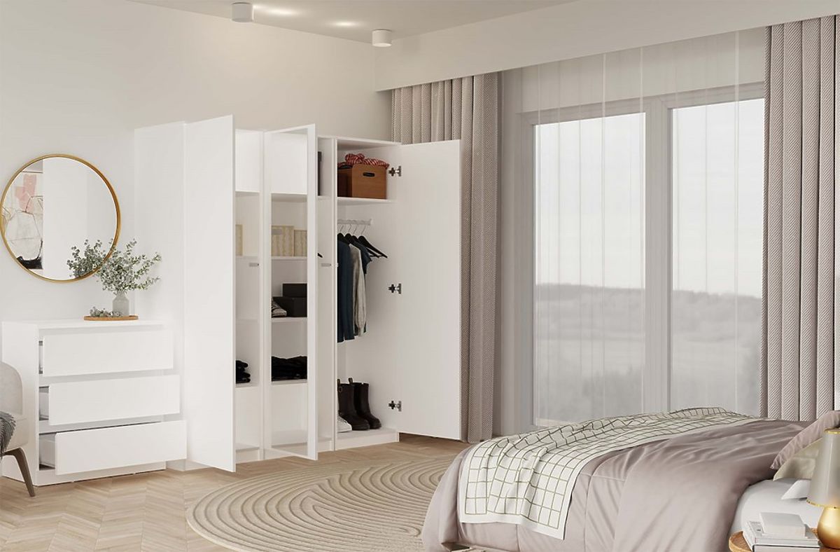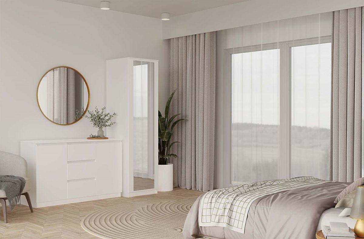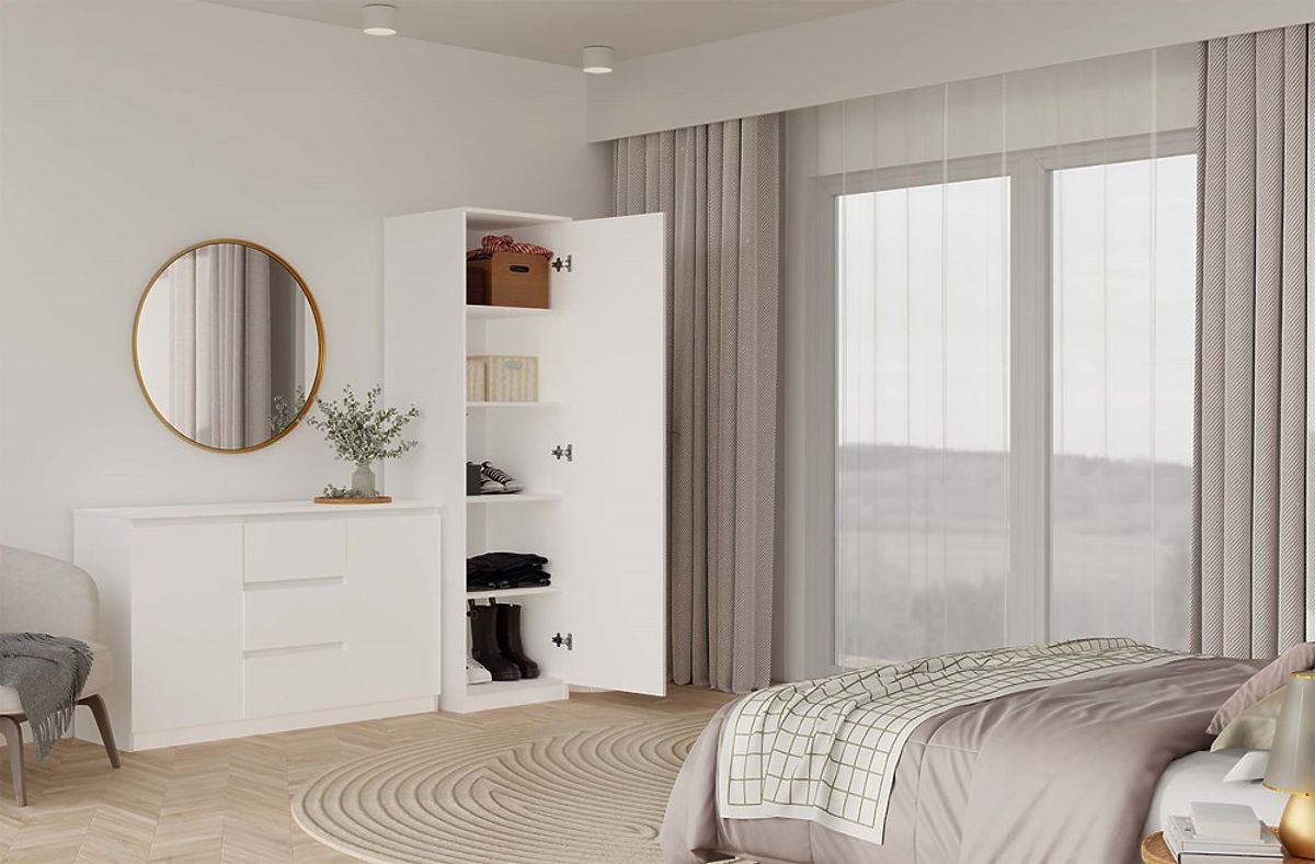 L'armoire SD-50 AVEC MIROIR est un meuble moderne et fonctionnel conçu pour un rangement pratique dans des espaces plus petits – chambre, entrée, dressing ou bureau. Grâce à sa face avant avec un grand miroir, elle agrandit optiquement l'espace et lui apporte légèreté, tout en remplissant une fonction pratique pour un usage quotidien.