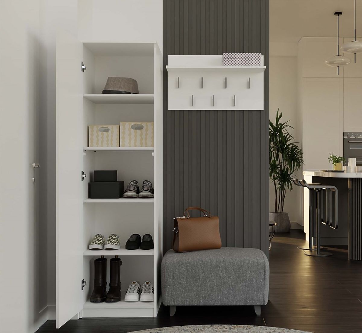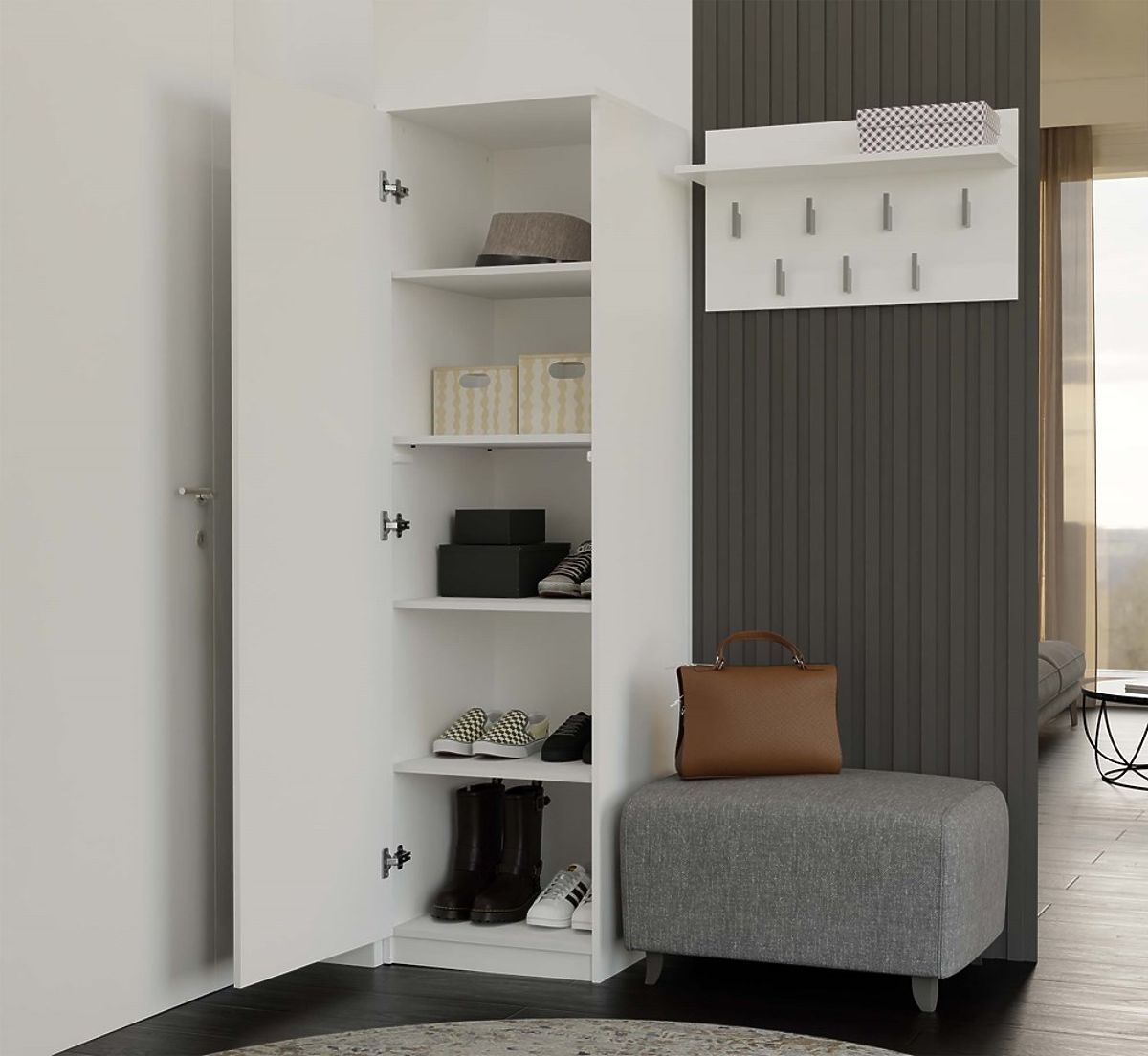 Inclus dans l'emballage : 4 étagères et 1 tringle – l'agencement est à choisir lors du montage selon l'usage.