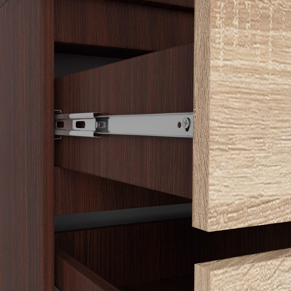 Les armoires présentées combinent fonctionnalité et design moderne. Fabriquées en panneaux laminés de haute qualité, elles présentent une résistance accrue à l'usure et aux autres dommages mécaniques. Les bords des armoires, étant les éléments les plus exposés aux dommages, ont été renforcés par l'utilisation de bandes ABS. Grâce à cela, le meuble conserve un aspect idéal tout au long de son utilisation. La combinaison de deux motifs de couleur - le wenge sombre et profond et le sonoma clair et frais - crée un design très original et moderne.