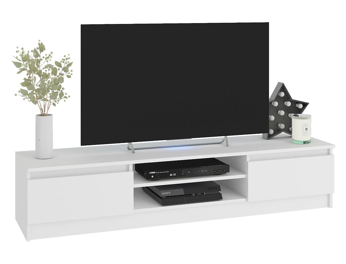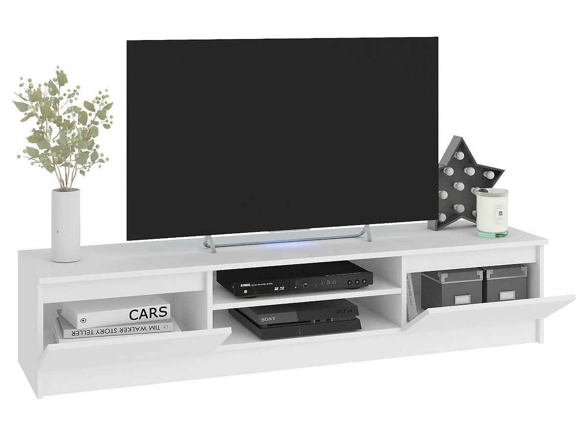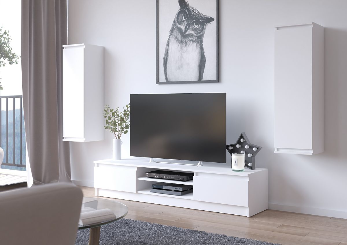 Le meuble TV et les armoires suspendues en blanc s'intègrent parfaitement dans un intérieur moderne. La teinte blanche classique est si universelle que l'ensemble de meubles aura fière allure dans une pièce aux couleurs pastel comme dans un salon avec des murs ou un tapis dans des tons plus sombres. Les meubles sont fabriqués en panneau laminé avec un bord ABS, résistant à l'abrasion, aux rayures et à une utilisation prolongée.
