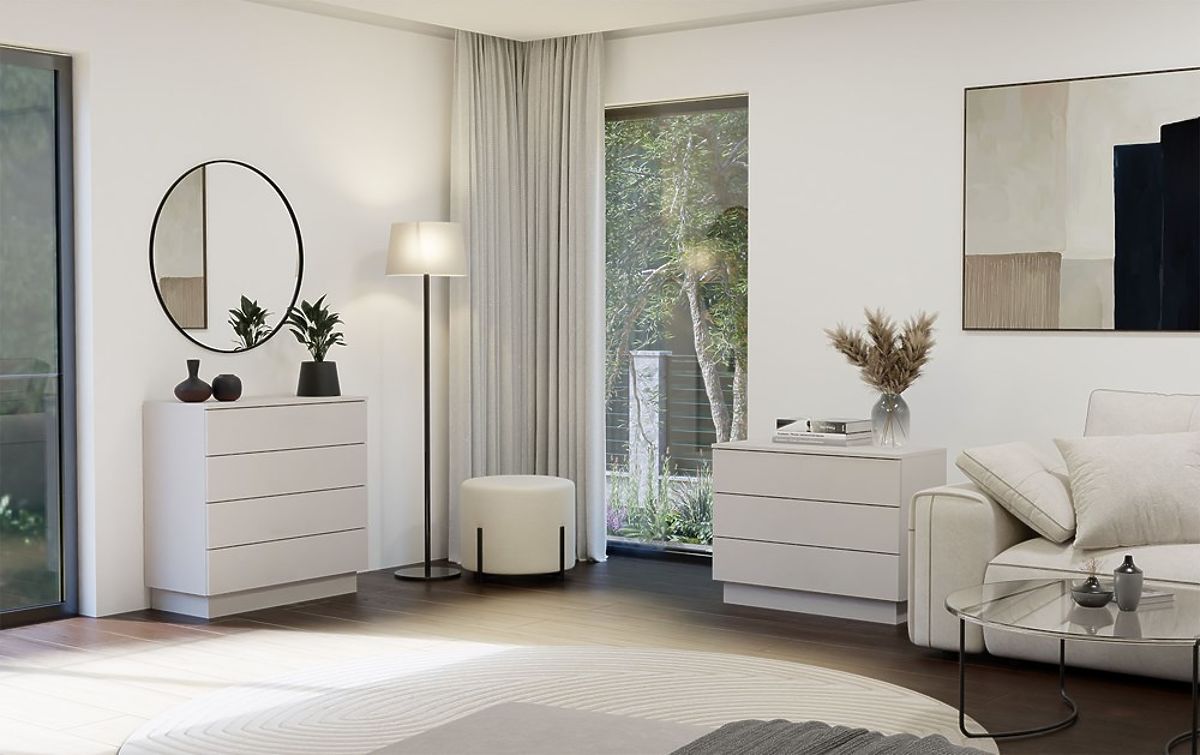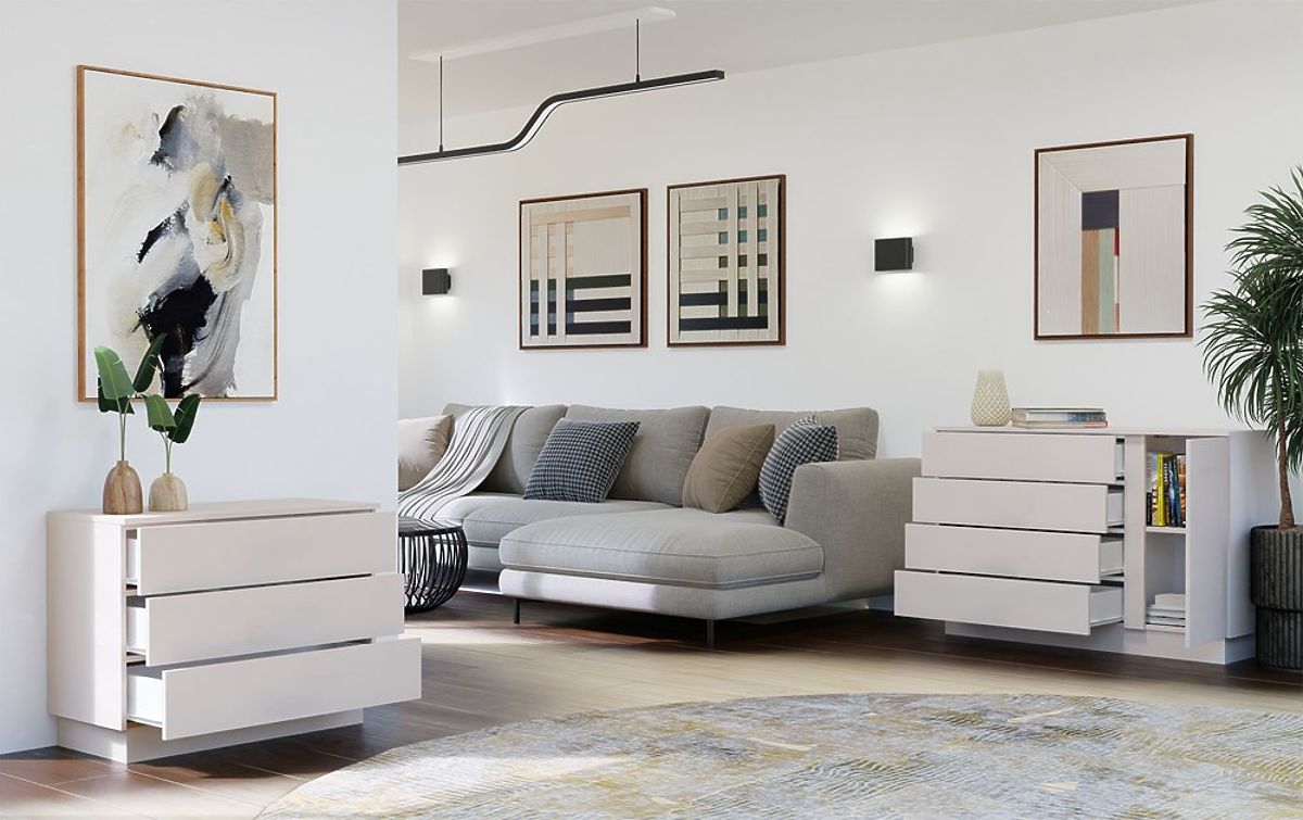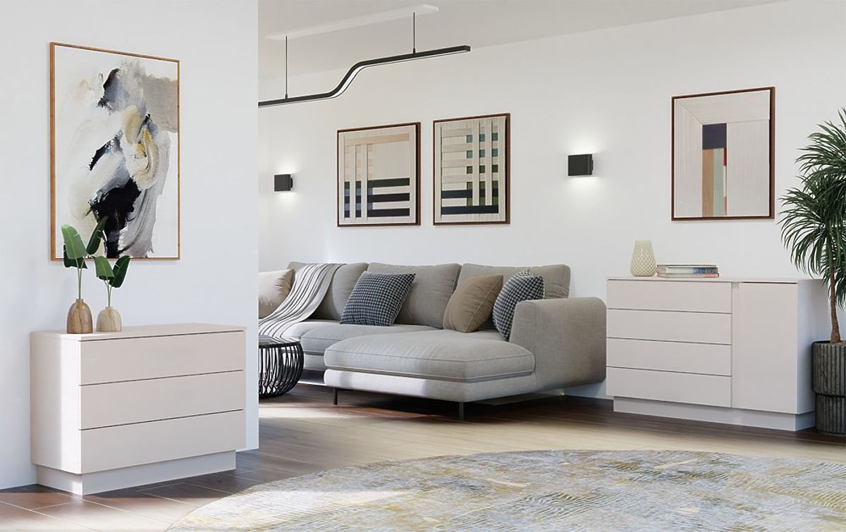 Commode moderne AMBER 3S avec 3 tiroirs spacieux en couleur cashmere. .. plus