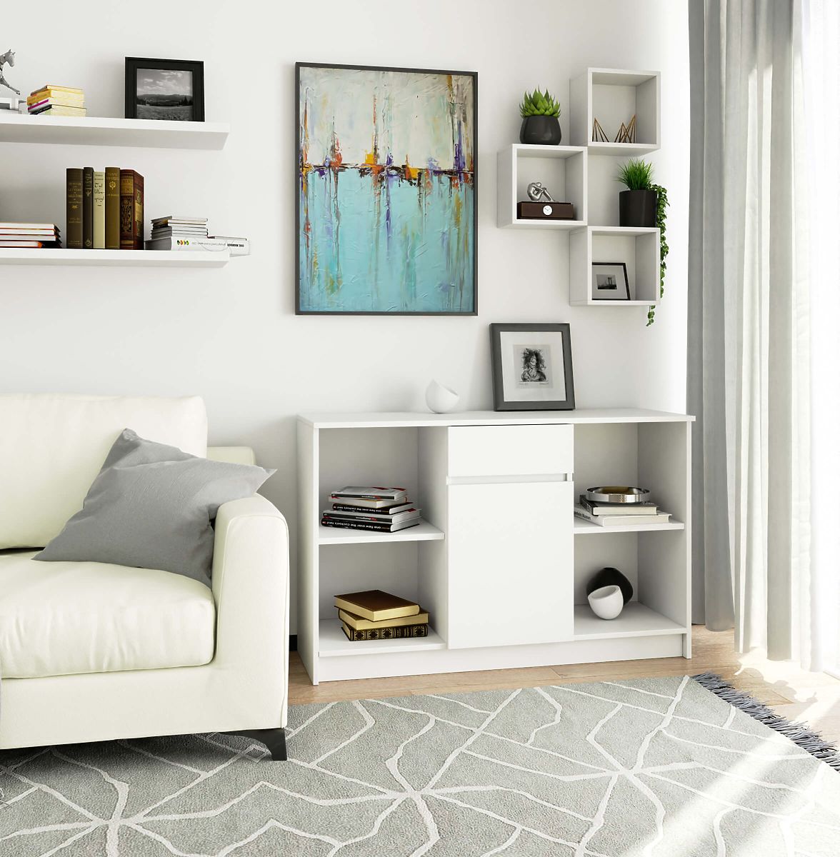 La commode blanche de la série B-17 peut servir d'élément indépendant dans n'importe quelle pièce. Grâce à sa conception modulaire, elle peut être combinée avec un autre segment de la série pour créer un bureau d'angle confortable (autres éléments sous forme de bureau à acheter dans notre magasin). La partie centrale de la commode comprend un tiroir et une porte fermée, permettant un rangement libre. De plus, elle dispose de quatre étagères indépendantes et symétriques offrant beaucoup d'espace d'exposition. La commode de 120 cm de long et 77 cm de haut est fabriquée en panneau laminé. Elle a été conçue pour s'adapter à la plupart des pièces. Elle peut être un élément intéressant dans le salon, servir de meuble fonctionnel pour le rangement dans la chambre, et convient également comme segment supplémentaire dans la cuisine. Grâce à sa couleur blanche neutre et son design minimaliste, elle devient un complément attrayant et surtout fonctionnel pour tout intérieur.