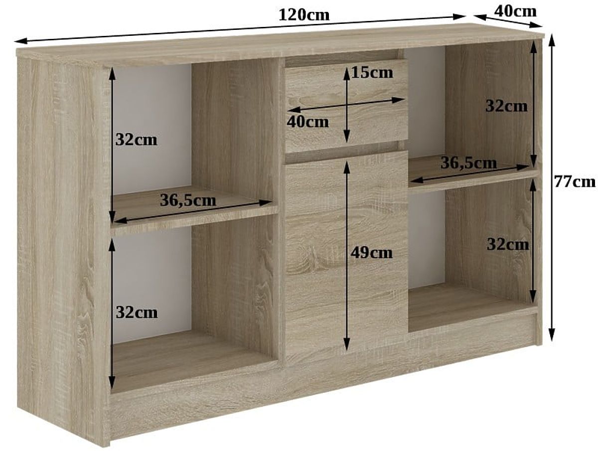Les dimensions du meuble sont 120 cm x 77 cm x 40 cm. Toutes les personnes à la recherche d'une option attrayante, de qualité, mais aussi économique pour aménager une pièce, sont invitées à découvrir cette offre intéressante. Nous espérons qu'elle répondra aux attentes des personnes les plus exigeantes. La commode se compose de deux étagères ouvertes, une derrière une porte et un tiroir. L'ensemble se présente magnifiquement seul ou en combinaison avec d'autres meubles de cette série. Nous vous invitons à l'achat.
