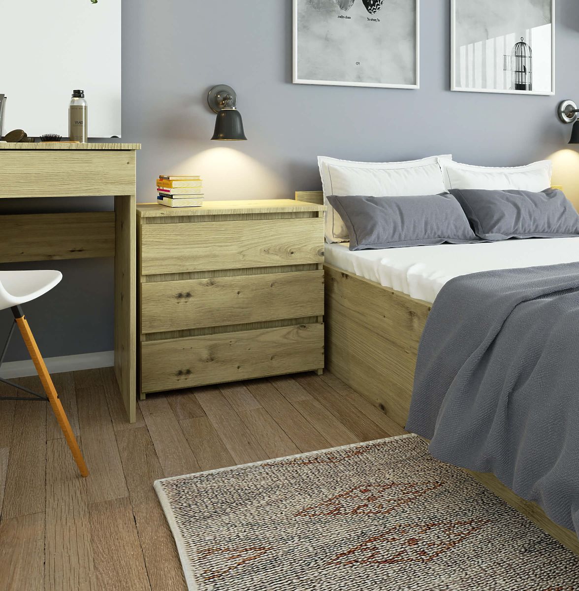 La commode chêne artisan dispose de 3 tiroirs faciles à ouvrir. Elle est idéale pour la chambre à coucher comme élément indispensable de son équipement. Les tiroirs peuvent contenir des sous-vêtements, des accessoires cosmétiques ou du linge de lit de rechange. Le plateau est parfait pour placer une lampe de chevet et déposer une lecture intéressante. Le meuble peut également être placé dans une chambre d'enfant ou d'adolescent.
