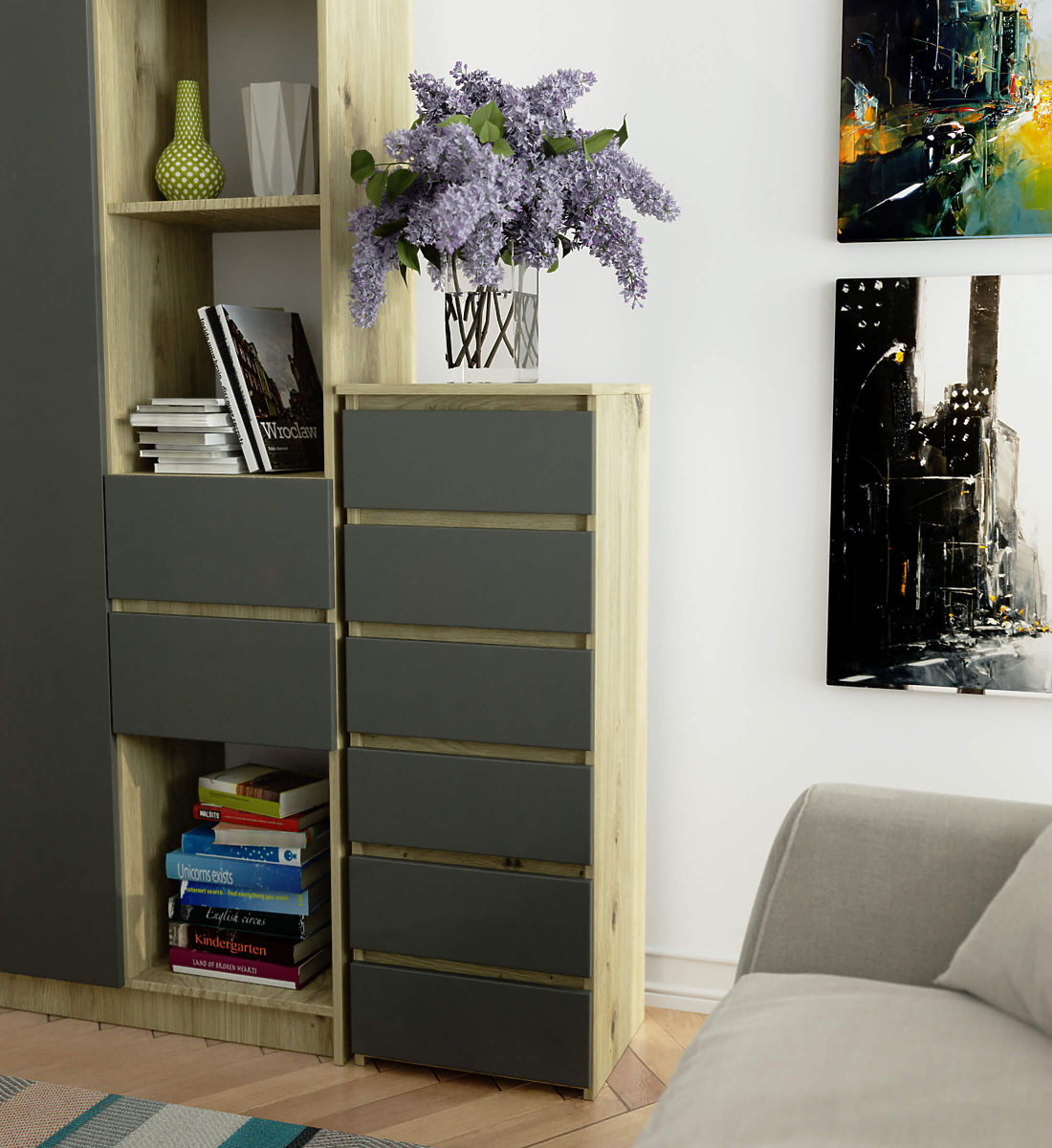 Commode CL6 avec 6 tiroirs en chêne artisan et gris graphite. .. plus