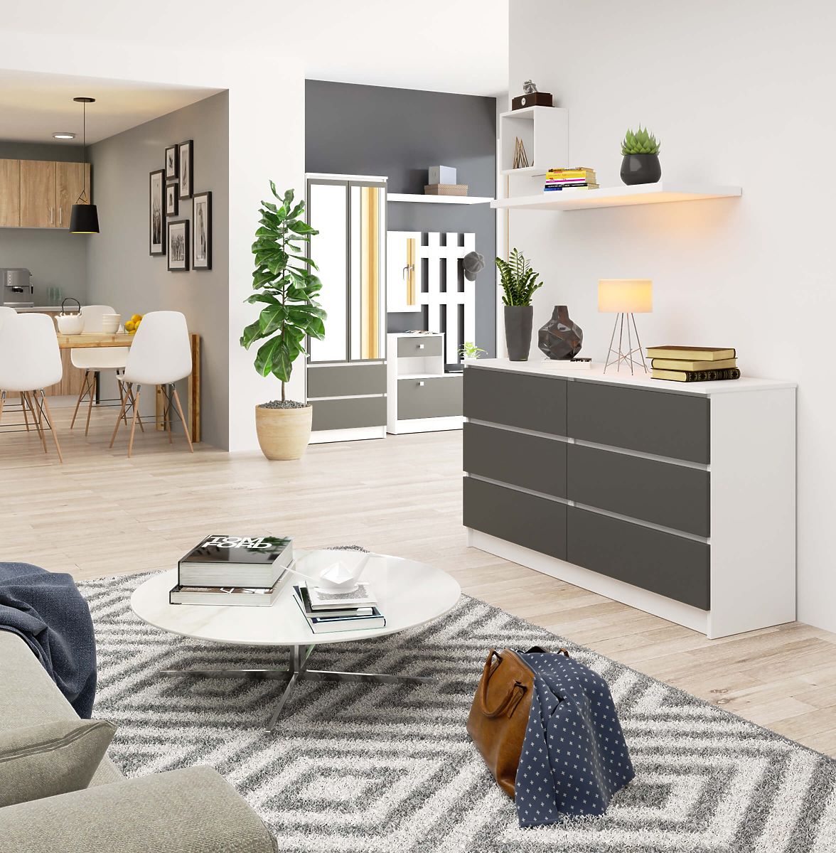 Commode en panneau laminé avec 6 tiroirs, blanc et gris graphite. .. plus