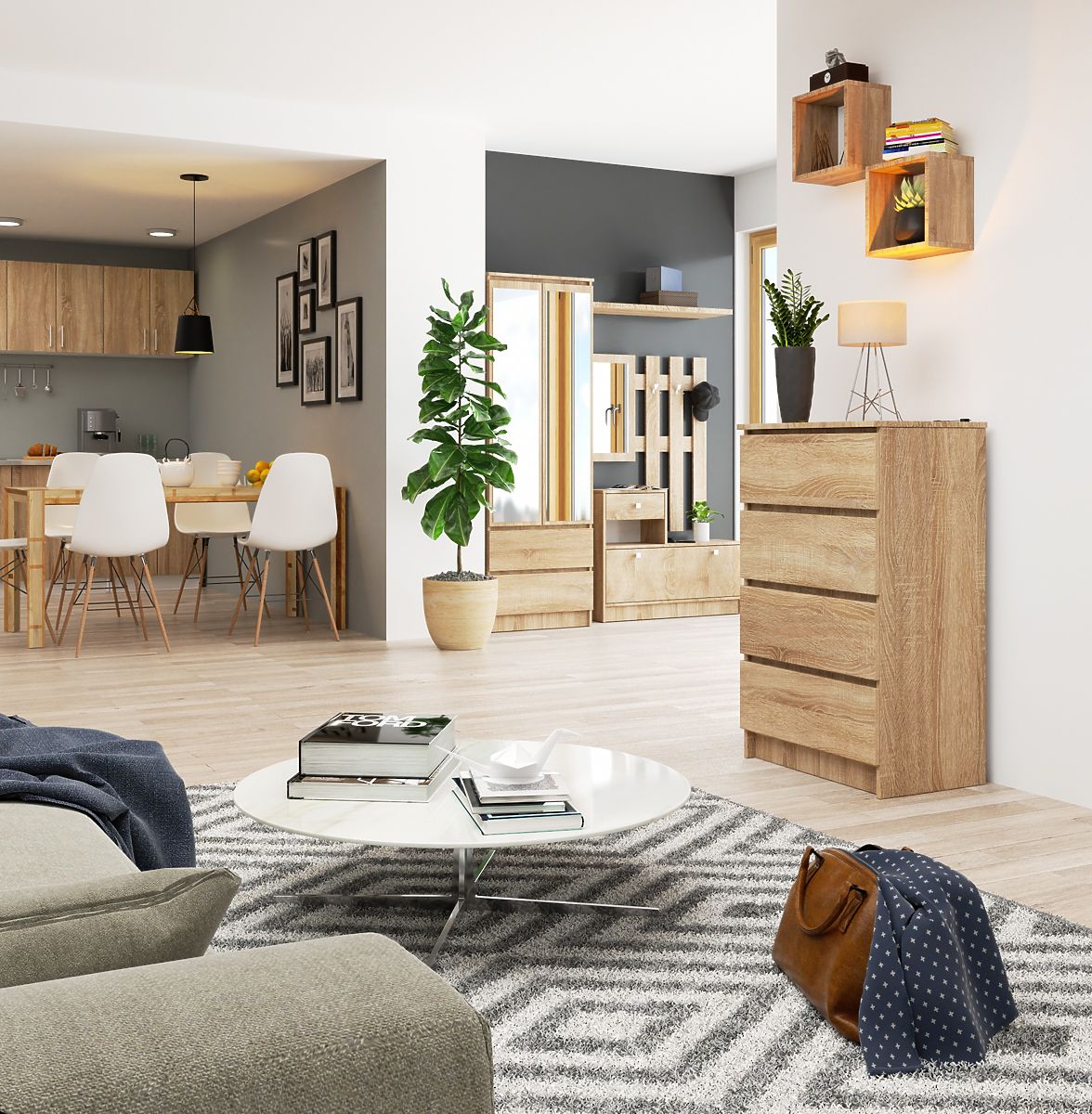 La petite commode K60 est une proposition maintenue dans une teinte à la mode, très populaire parmi les clients. Il s'agit bien sûr du chêne sonoma - une nuance qui s'intègre parfaitement dans les intérieurs modernes, est très universelle et se combine merveilleusement avec toutes les autres couleurs. La commode elle-même est un meuble de haute qualité, équipé de quatre tiroirs pratiques. Cette proposition est destinée aux personnes qui souhaitent aménager leur salon, chambre à coucher, hall d'entrée, salle à manger, mais aussi un intérieur de bureau. La haute qualité combinée à un prix bas convaincra sûrement les clients qui apprécient la simplicité et l'élégance dans la meilleure exécution. Vous pouvez assortir la commode avec d'autres meubles de la même collection pour créer l'agencement de vos rêves dans n'importe quel espace choisi.