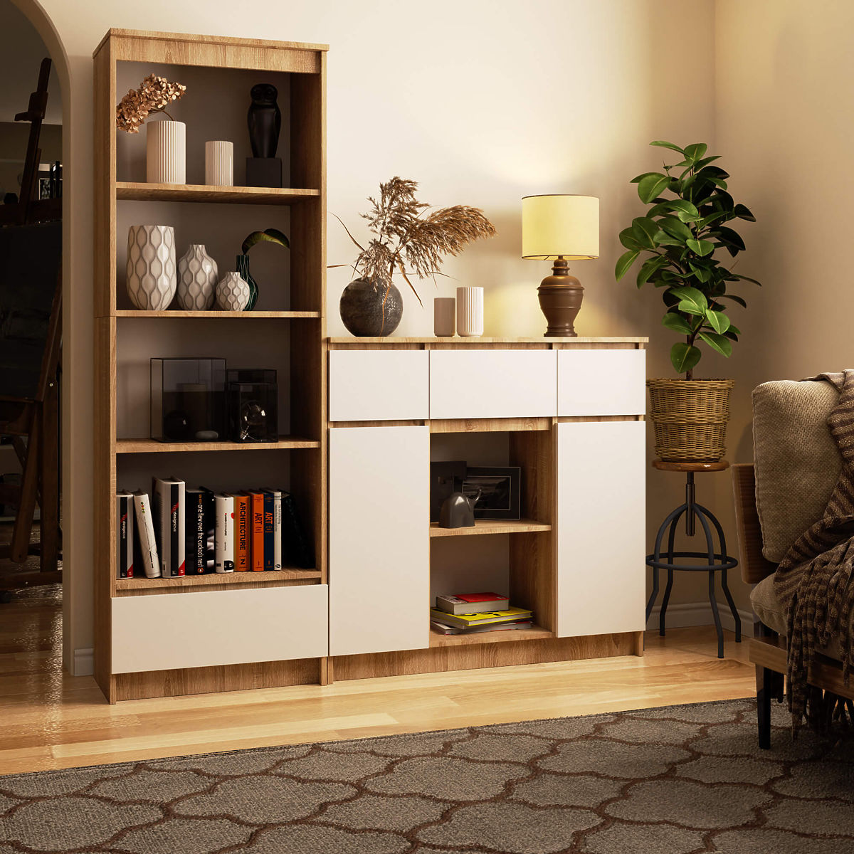 Commode en chêne Sonoma et blanc avec 3 tiroirs et 2 portes. .. plus