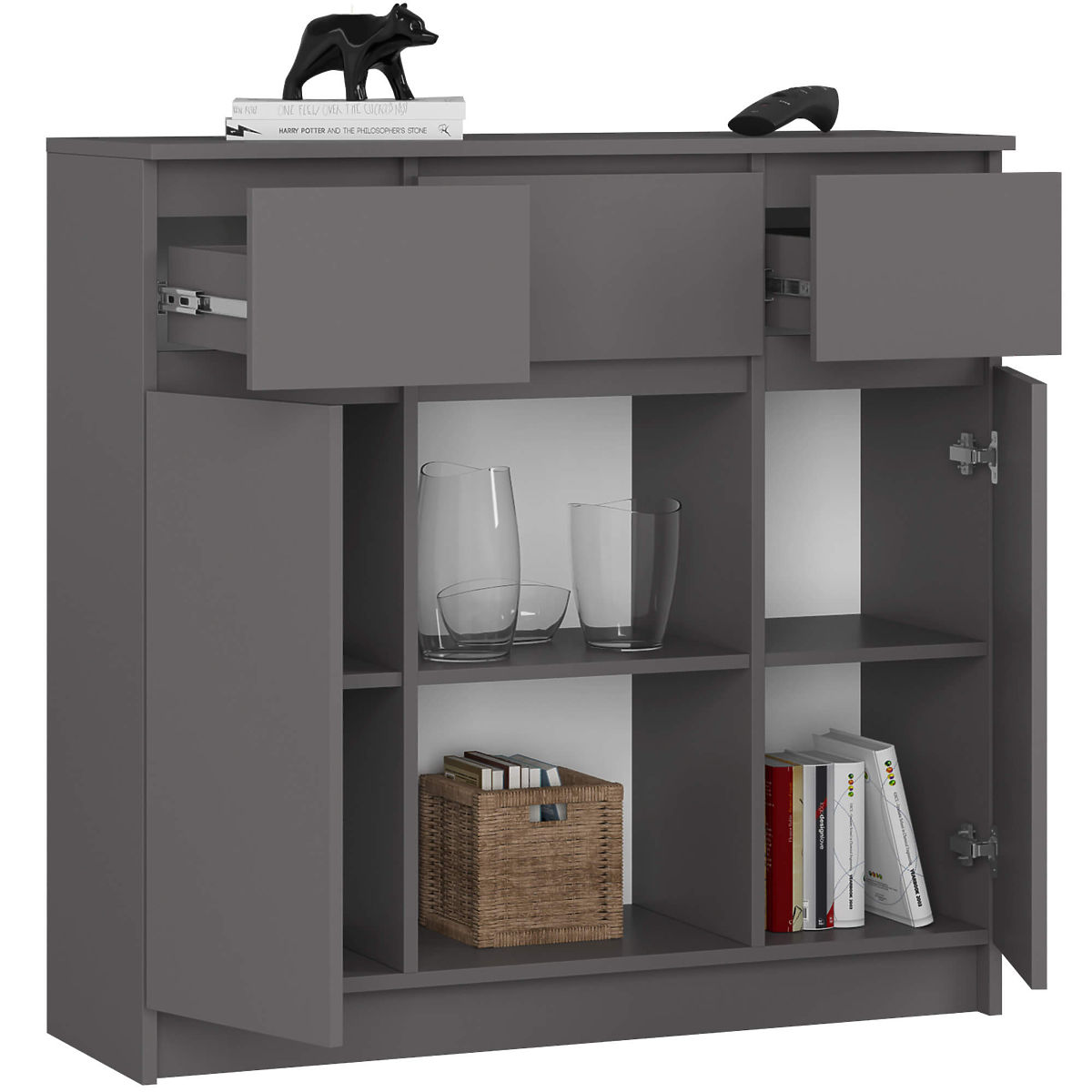 Commode en panneau laminé gris graphite avec 3 tiroirs et 2 portes. .. plus