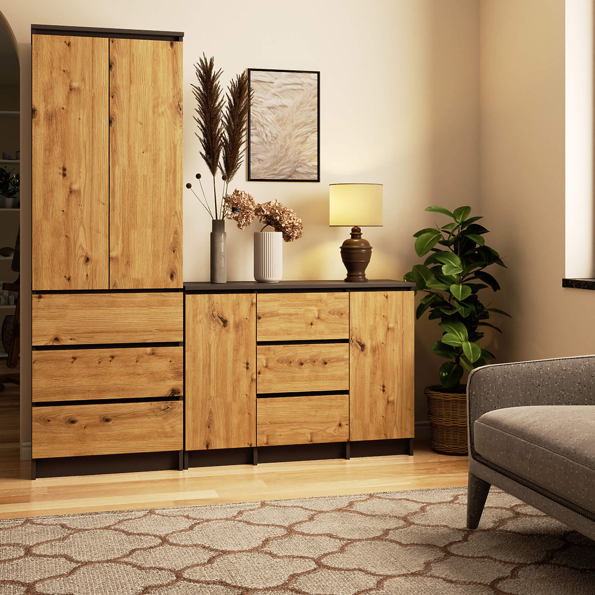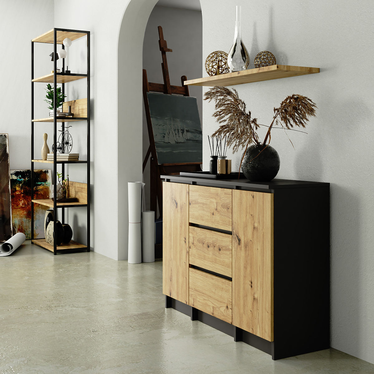 Commode en panneau laminé avec tiroirs et portes, couleur Gris Graphite et Chêne Artisan. .. plus