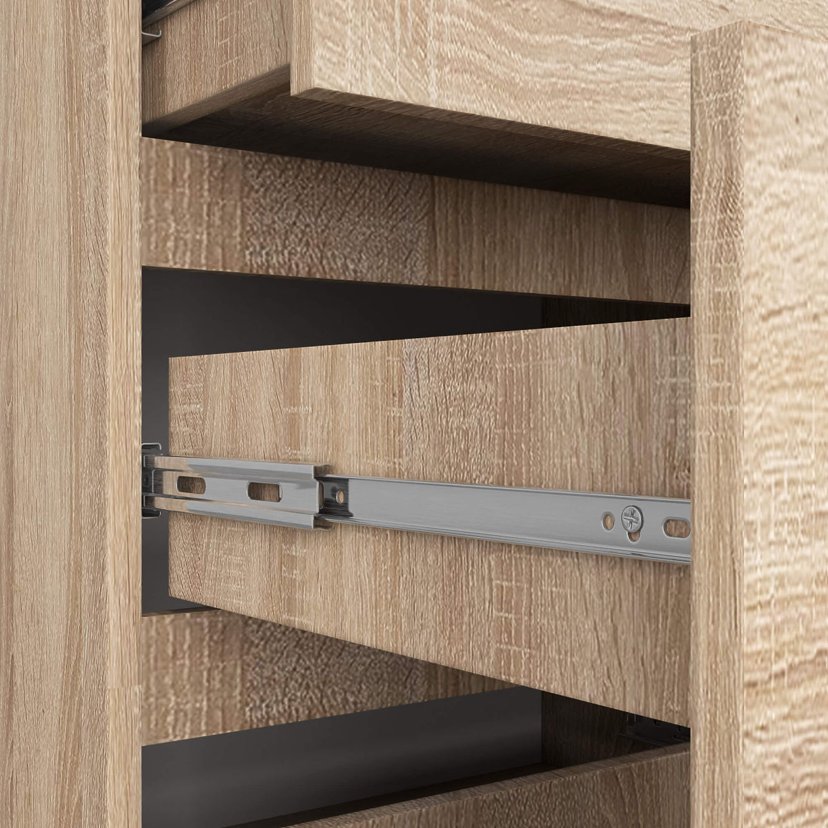 Dix tiroirs spacieux sont l'endroit idéal pour ranger des documents, des boîtes d'objets divers ou des vêtements. Cela facilite le maintien de l'ordre dans l'appartement plus que jamais ! Le coulissement fluide des tiroirs est assuré par des glissières à billes métalliques, garantissant un mouvement doux et silencieux.