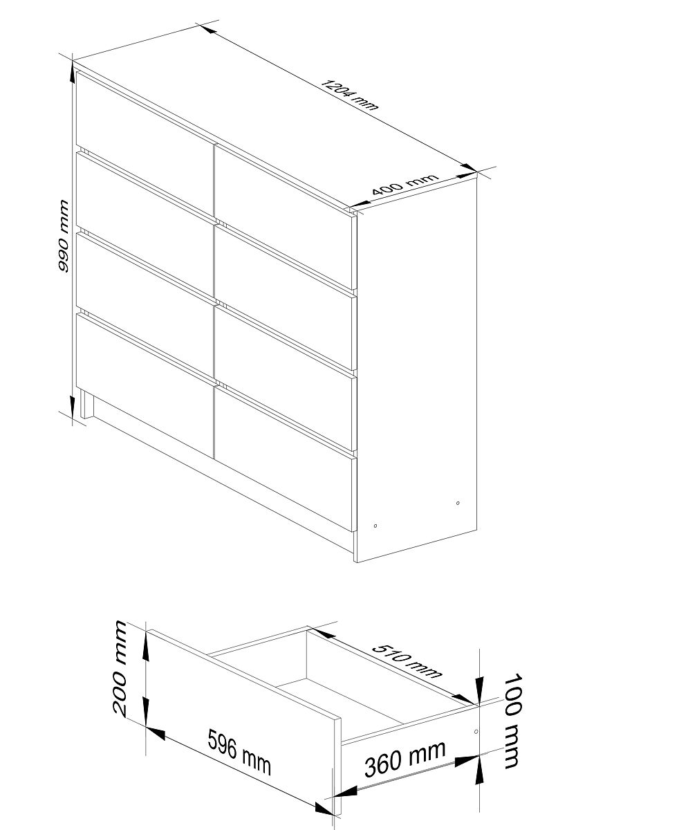 Commode en panneau laminé avec 8 tiroirs et chant ABS. .. plus