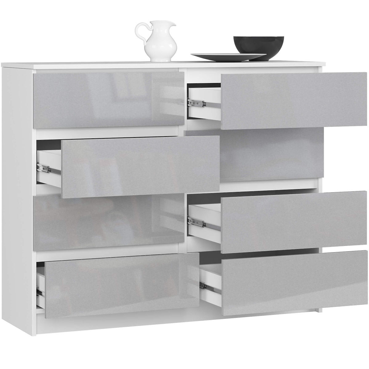 Nous proposons une grande commode avec 8 tiroirs. La commode a un corps blanc semi-mat fabriqué en panneau laminé de 16 mm d'épaisseur, très résistant à l'abrasion. Les façades sont en panneau MDF avec un revêtement acrylique de 19 mm d'épaisseur, caractérisé par une haute durabilité et résistant à la décoloration due à une exposition intense au soleil. Les bords sont dotés d'un bord ABS qui assure une haute protection contre les dommages mécaniques et l'abrasion. Les tiroirs sans poignées ont une couleur métallique moderne avec un brillant élevé. Les tiroirs sont montés sur des glissières à billes métalliques. La commode a une apparence simple et très universelle. Elle s'intègre parfaitement dans n'importe quel intérieur, et sera tout aussi belle dans un salon, une chambre ou même un bureau. Grâce à ses tiroirs très spacieux et volumineux, chaque pièce restera bien rangée. Il est possible de coordonner avec succès d'autres meubles de la série CLP avec ce modèle de commode.