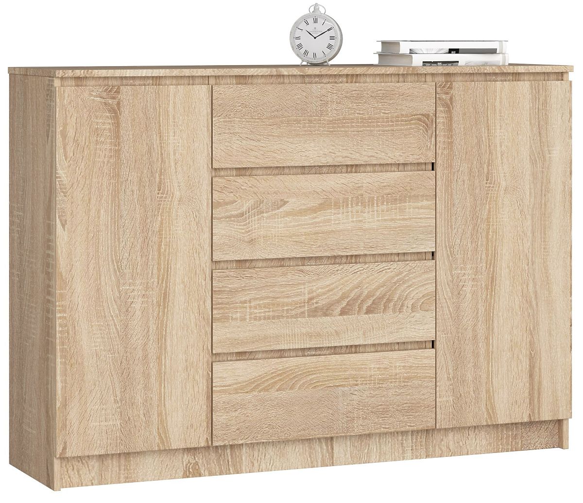 Grande, spacieuse et fonctionnelle, cette commode est un meuble prisé, notamment dans des pièces comme le salon ou la chambre. Nous vous présentons la commode K140 mesurant 99 cm de hauteur, 138 cm de longueur et 40 cm de profondeur, fabriquée en panneau stratifié de 16 mm d'épaisseur du fabricant Kronospan. Cela la rend résistante à l'abrasion. Les bords sont également correctement protégés par une bordure ABS. Le meuble dispose de 4 tiroirs qui se déplacent en douceur grâce à des glissières à billes en métal, et de deux armoires. À l'intérieur de chaque porte se trouve une étagère. Le meuble est de couleur chêne sonoma, une couleur extrêmement élégante et stylée. La commode a une forme simple et un caractère universel, ce qui la rend idéale pour des pièces de styles et d'agencements variés. Elle est durable, spacieuse et confortable à utiliser.