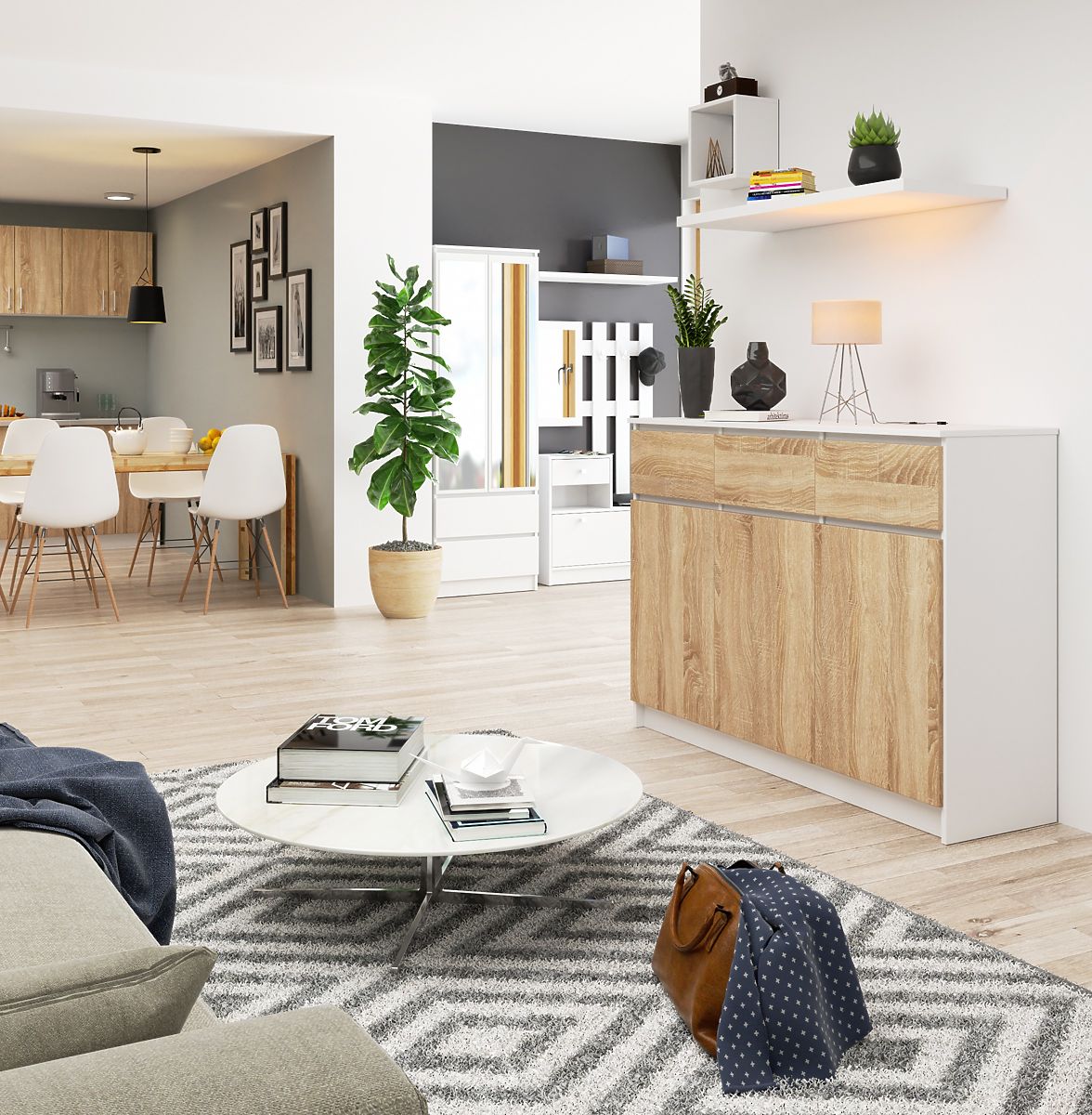 Commode en panneau laminé blanc et chêne Sonoma avec 3 tiroirs et 3 portes. .. plus