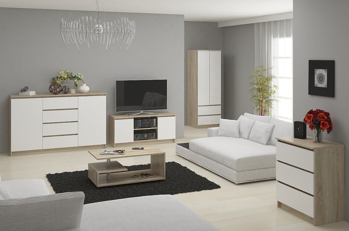La commode K 140 cm 3 portes 3 tiroirs est une commode pratique qui se distingue par un design moderne. Elle est fabriquée en panneau stratifié de haute qualité de 16 mm résistant à l'abrasion et à d'autres types de dommages. Le fabricant du panneau est Kronospan, un leader dans la production de panneaux stratifiés, de panneaux de particules (PB), de panneaux de fibres (MDF) et de panneaux OSB. Grâce à ses usines dans le monde entier, il fournit des produits de la plus haute qualité dans l'industrie du meuble.
