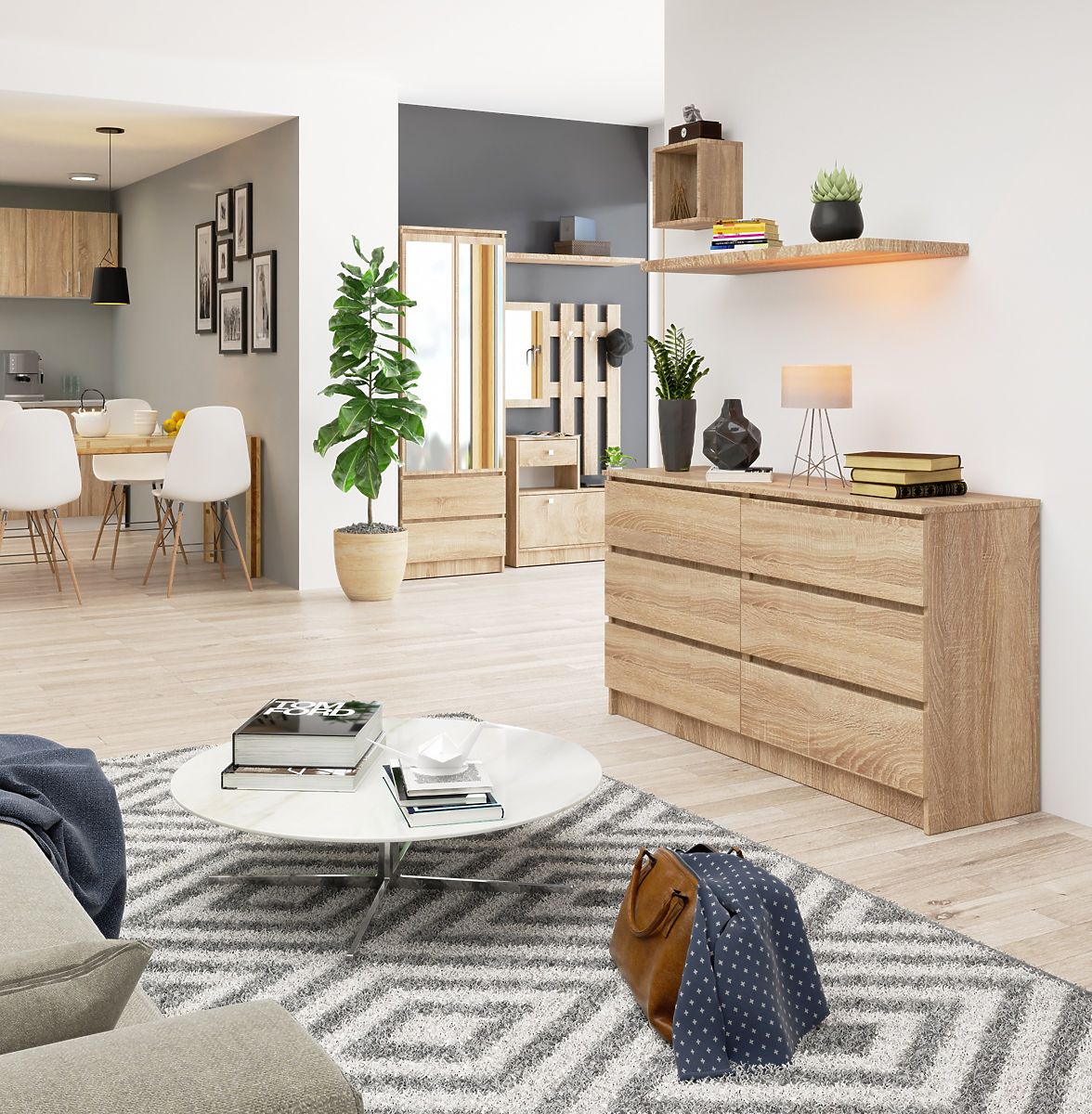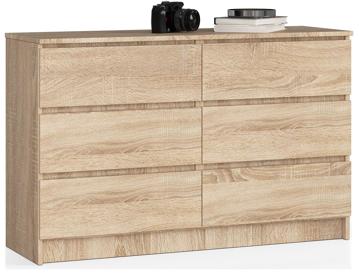 Six tiroirs pratiques, un long plateau et une couleur très prisée par ceux qui préfèrent des meubles faciles à nettoyer, universels et intemporels - voilà les caractéristiques qui définissent la commode K140 en couleur chêne sonoma. Cette offre mérite l'attention principalement grâce à son design et à sa fonctionnalité exceptionnelle, mais il vaut également la peine de prêter attention à la haute qualité et à la finition soignée du meuble, qui peut être utilisé avec succès tant dans les espaces de bureau que dans le salon, la salle à manger, la chambre ou de nombreux autres intérieurs résidentiels. La fabrication solide à partir de matériaux durables sera certainement appréciée même par les clients les plus exigeants, pour lesquels le prix avantageux du meuble sera également un atout.