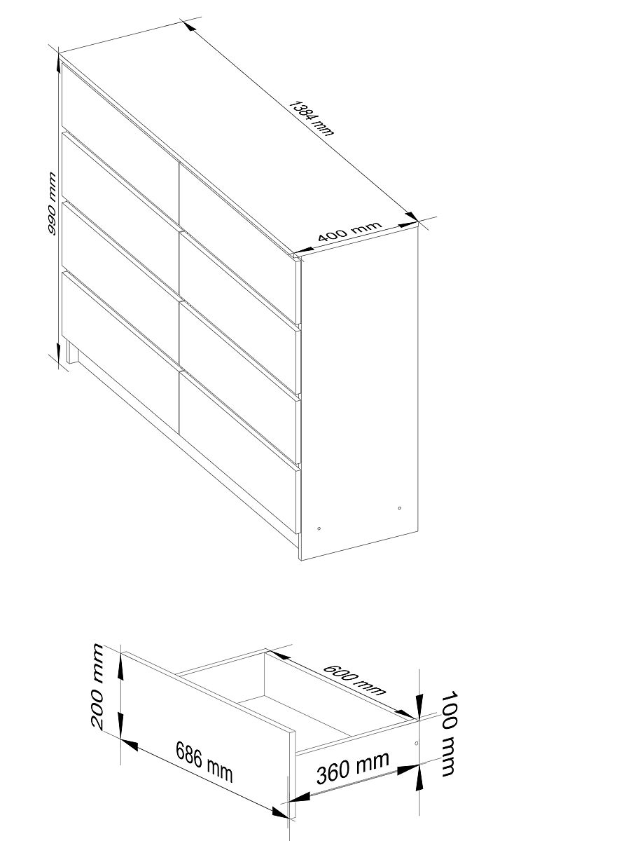 Fabriquée en panneau stratifié de 16 mm de chez Kronospan. Les bords de la commode sont recouverts d'un chant ABS, augmentant la résistance de la commode aux dommages.