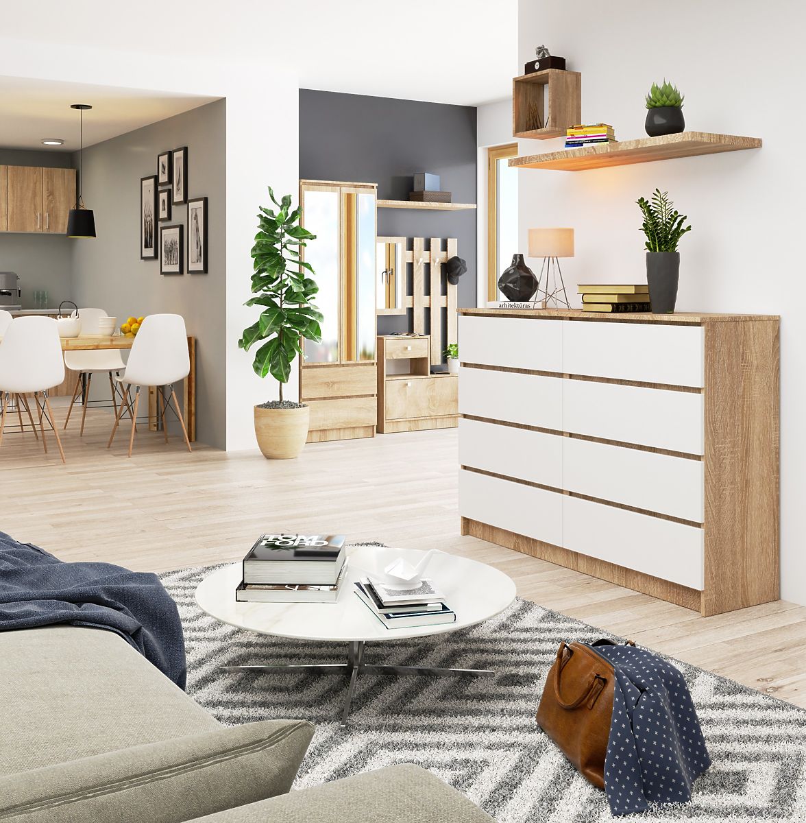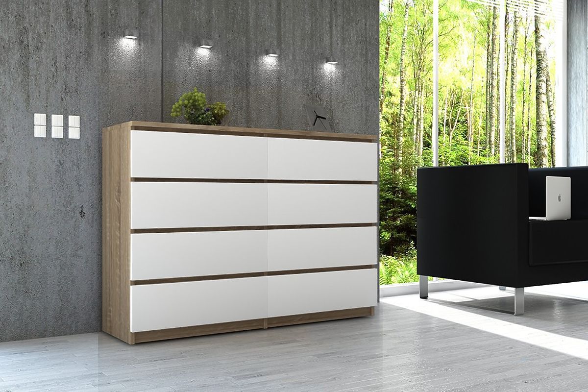 Commode moderne avec 8 tiroirs spacieux en chêne Sonoma et blanc. .. plus