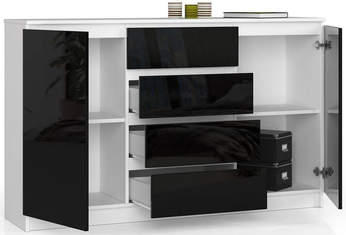La commode K 160 cm est un meuble aux qualités visuelles exceptionnelles. Le noir universel des façades brillantes s'harmonise parfaitement avec le semi-mat du corps. La palette monochrome est idéale pour les intérieurs modernes et minimalistes, tels que le salon, la chambre ou la chambre d'adolescent.