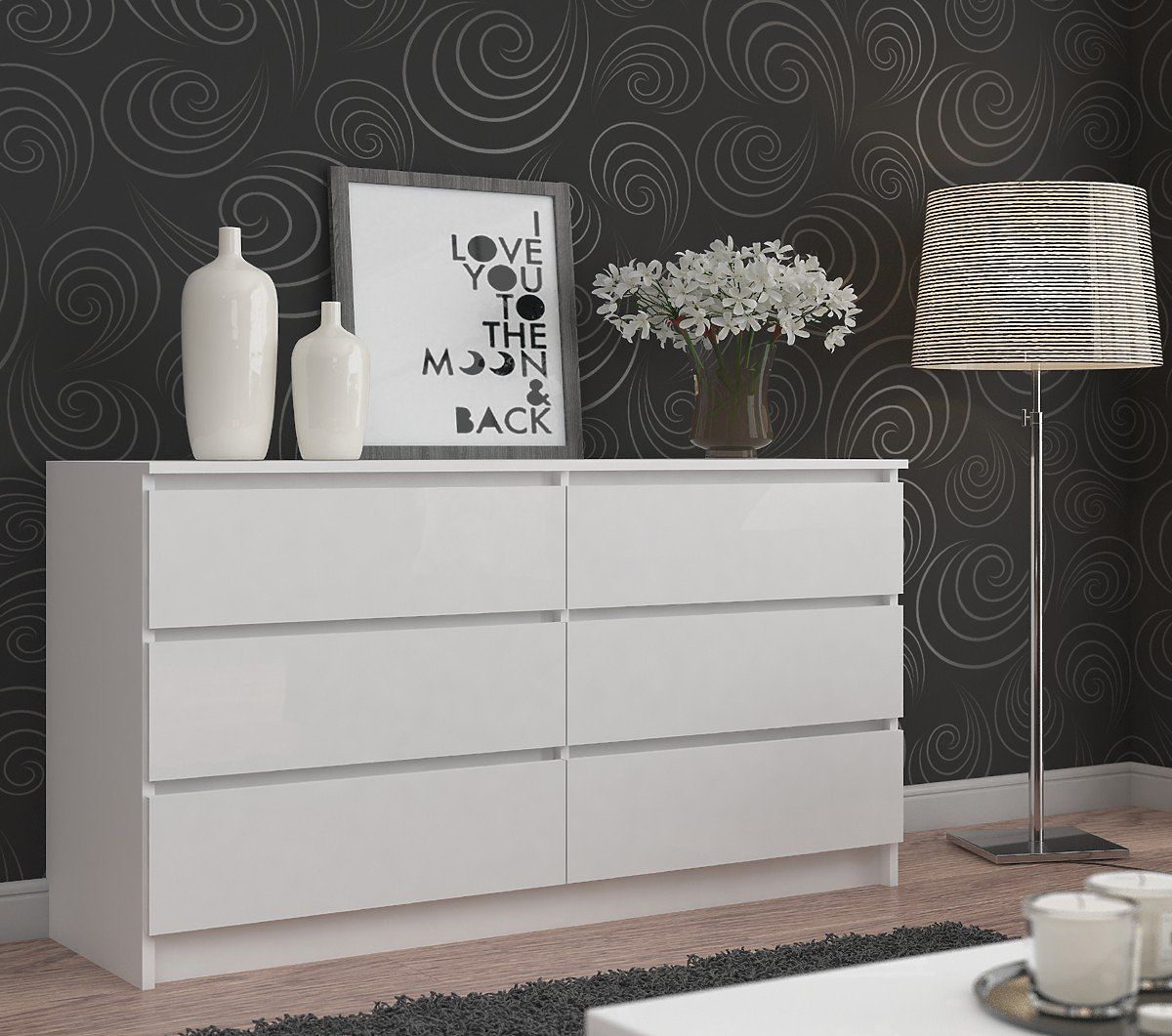 Cette belle commode classique en blanc est l'une des nombreuses offres intéressantes de notre boutique en ligne. Le meuble se compose de six tiroirs spacieux. Chacun d'eux peut facilement contenir tous les objets nécessaires dans la pièce concernée. La commode s'intégrera parfaitement dans le salon, mais aussi dans une chambre d'enfant ou d'adolescent. Elle peut également être utilisée dans une chambre à coucher, une chambre d'amis, une salle à manger, une entrée, ainsi que dans des pièces à caractère non résidentiel - par exemple dans les hôtels ou les bureaux.