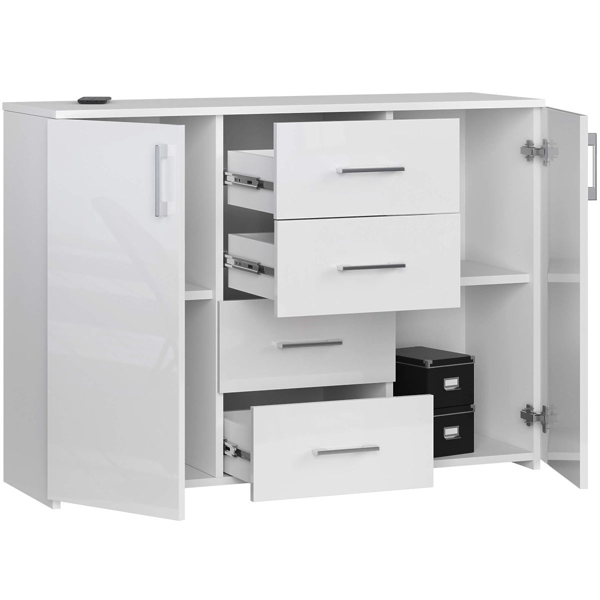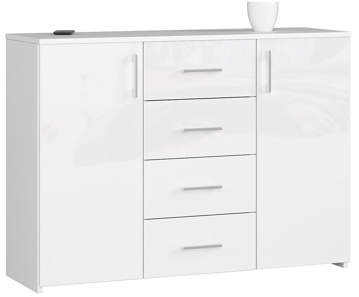 Commode blanche brillante avec 4 tiroirs et 2 portes. .. plus