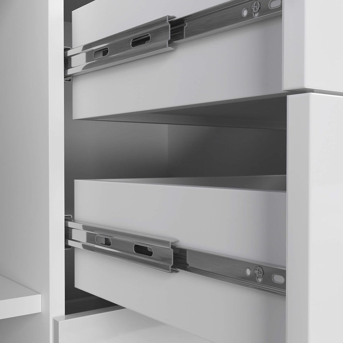 - Les tiroirs glissent sur des rails à billes métalliques
