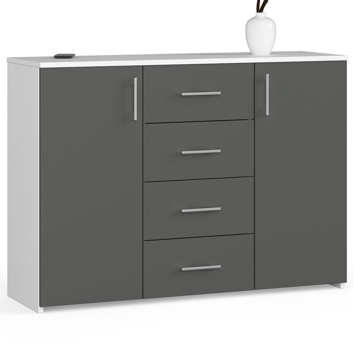 La commode blanc / gris graphite est un meuble grand et spacieux avec de nombreuses fonctions utilitaires. De chaque côté de la commode se trouvent des portes, derrière lesquelles se trouvent 4 étagères profondes. Le centre du meuble est également très fonctionnel, car il est équipé de 4 tiroirs profonds. La commode offre donc beaucoup d'espace de rangement.